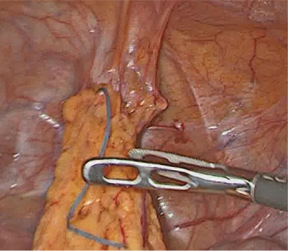 At surgery, the uterus was found to be intact (no visible evidence of perforation). The IUD turned out to be localized intraperitoneally, adherent to the urinary bladder dome and its superior surface by omental adhesions (Fig. 2). This location was in line with the findings from the computed tomography. A step-by-step atraumatic laparoscopic freeing of the device from the omental and urinary bladder adhesions enabled its final removal (Fig. 3). No blood loss was observed. The patient was discharged on the second postoperative day in a good general condition.