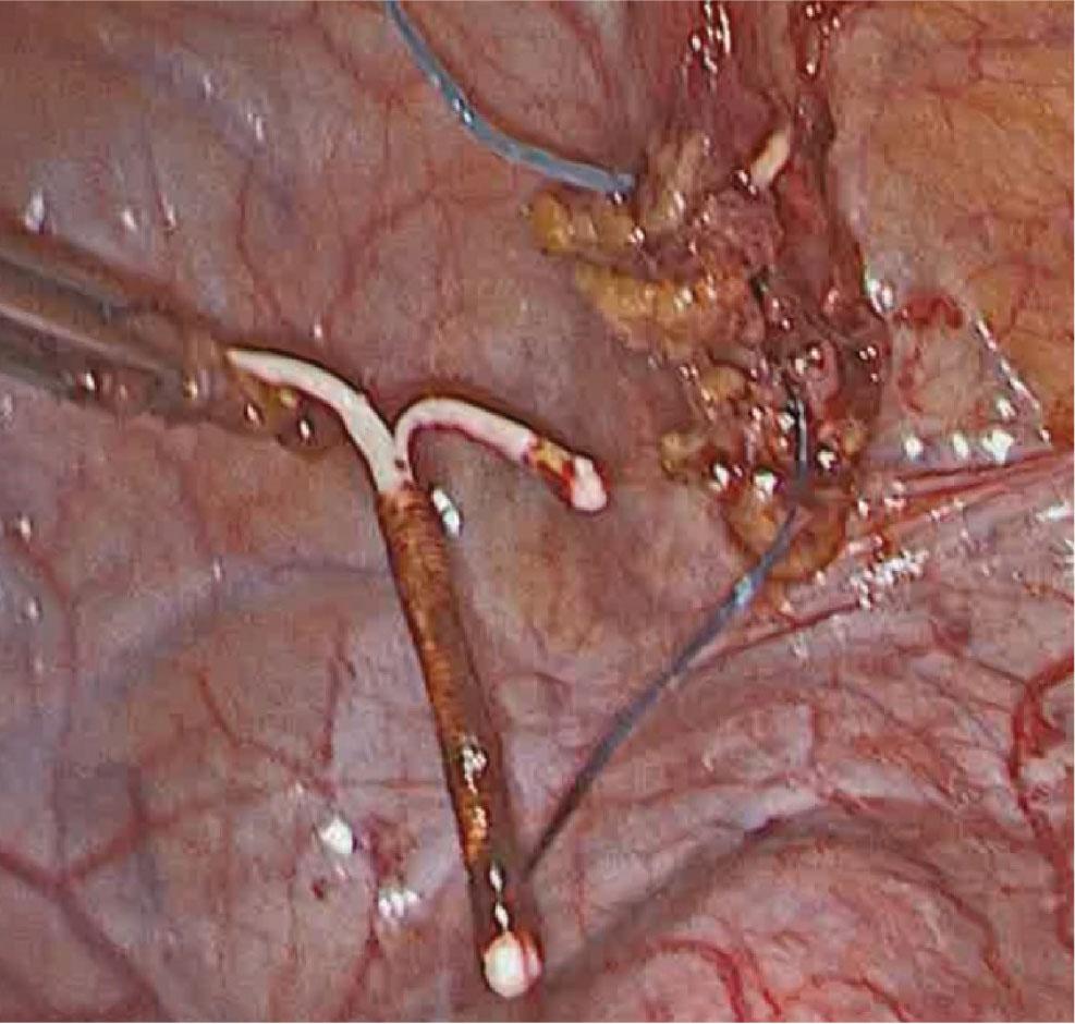 At laparoscopy, the contraceptive device was found to be fully covered by omental adhesions and adherent to the urinary bladder’s dome and superior surface.