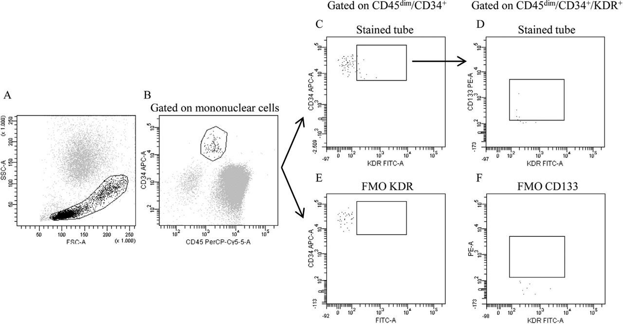 Typical flow cytometry gating technique for circulating Endothelial Progenitor Cells (EPCs) detection. (A) To filter out granulocytes, dead cells, and debris, mononuclear cells were gated in a forward-scatter (FSC) side-scatter (SSC) plot by means of blood samples. Then, cells were successively gated depending on the expression of (B) CD45dim and CD34, (C) Kinase domain receptor (KDR), and (D) CD133. FMO (fluorescence minus one) staining was used to create the gates depicting the (E) KDR and (F) CD133 events. EPCs in circulation were classified as CD45dim/CD34/KDR or CD45dim/CD34/KDR/CD133 cells.