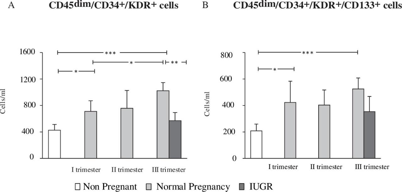 Expression of circulating Endothelial Progenitor Cells (EPCs) during healthy and Intra-uterine Growth Restriction (FGR) complicated pregnancy in maternal blood. (A) Pregnancies complicated by FGR at comparable gestational ages resulted in considerably decreased levels of EPCs, which were recognized by flow cytometry as CD45dim/CD34/KDR cells, in the I trimester when differentiated with non-pregnant women and continued to decrease. (B) There were no appreciable differences in EPCs classified as CD45dim/CD34/KDR/CD133 cells between FGR and healthy pregnancies. *p < 0.05, **p < 0.02, ***p ≤ 0.001.