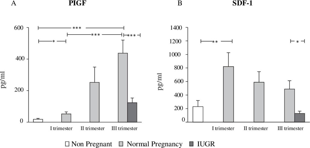 Concentration of Placental Growth Factor (PlGF) and Stromal Derived Factor (SDF-1) in healthy and Fetal Growth Restriction (FGR) pregnancy. (A) During healthy pregnancy, PlGF levels gradually increased; however, at the same gestational age, they were considerably lower in FGR than in healthy pregnancy. (B) SDF-1 levels grew during normal pregnancy, peaking in the first trimester and gradually decreasing as the pregnancy progressed, although they were lower in FGR than during normal pregnancy. *p < 0.05, **p < 0.02, ***p ≤ 0.001.