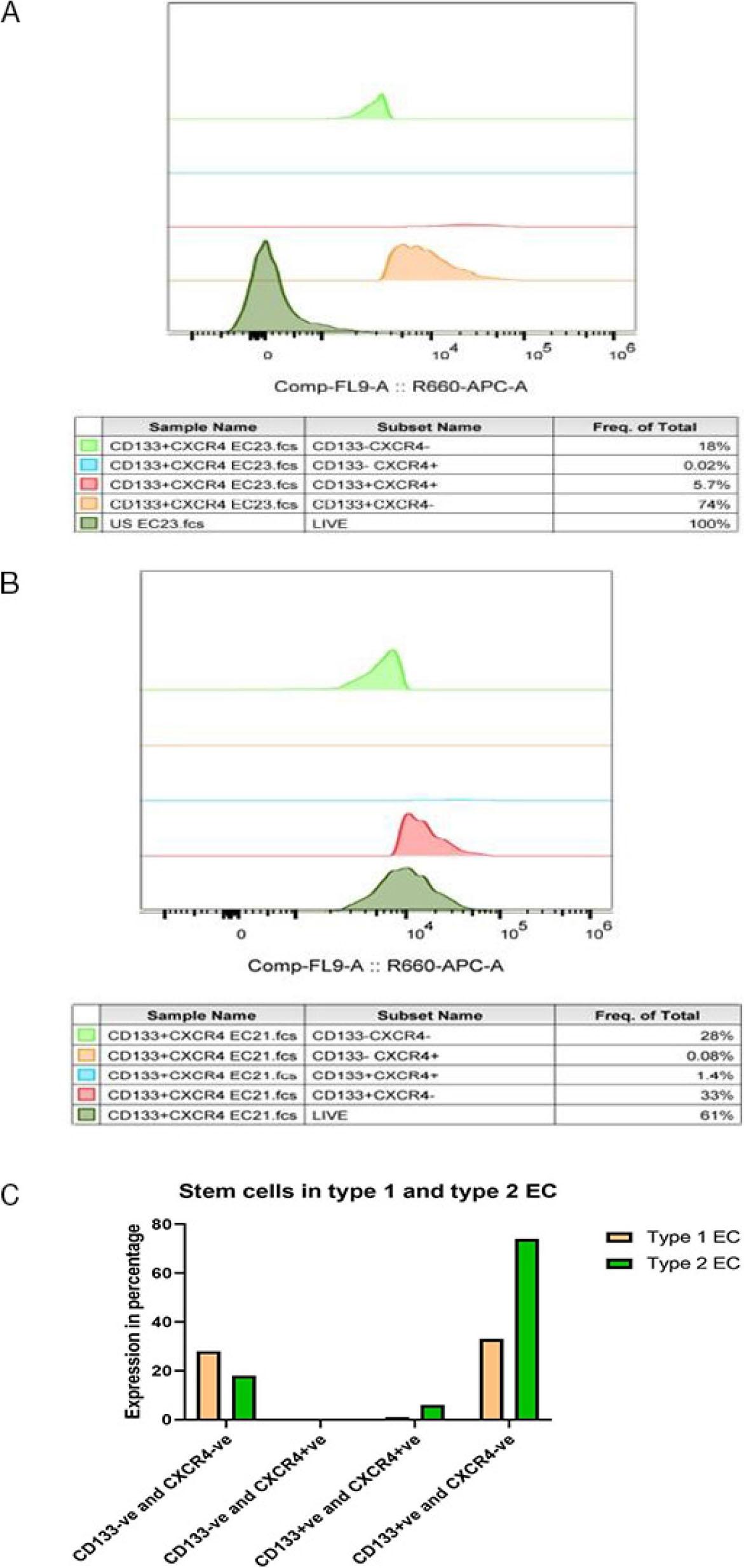 Having ascertained the stemness property of CD133+ cells, we were interested in seeing the proportion of cells expressing this marker in type I and type II endometrial cancer. Since CD133+CXCR4+ endometrial cancer cells were shown to possess more significant proliferation, clonogenic, tumourigenic, and chemoresistance abilities (17), we also analysed the proportion of these double positive cells in primary cell culture established from patient’s tumour sample diagnosed to be type I endometrial cancer and in other patient’s tumour sample diagnosed to be type 2 endometrial cancer (Fig. 2A & 2B). The proportion of suspected cancer stem cell population (CD133+CXCR4+ and CD133+CXCR4−) was found to be higher in primary cells established from type II endometrial tumour sample (5.7% and 74%) as compared to primary cells established from type I endometrial tumour sample (1.4% and 33%) (Fig. 2C). This signifies that the cancer stem cell population is higher in type II endometrial cancer as compared to the less harmful type I endometrial cancer.