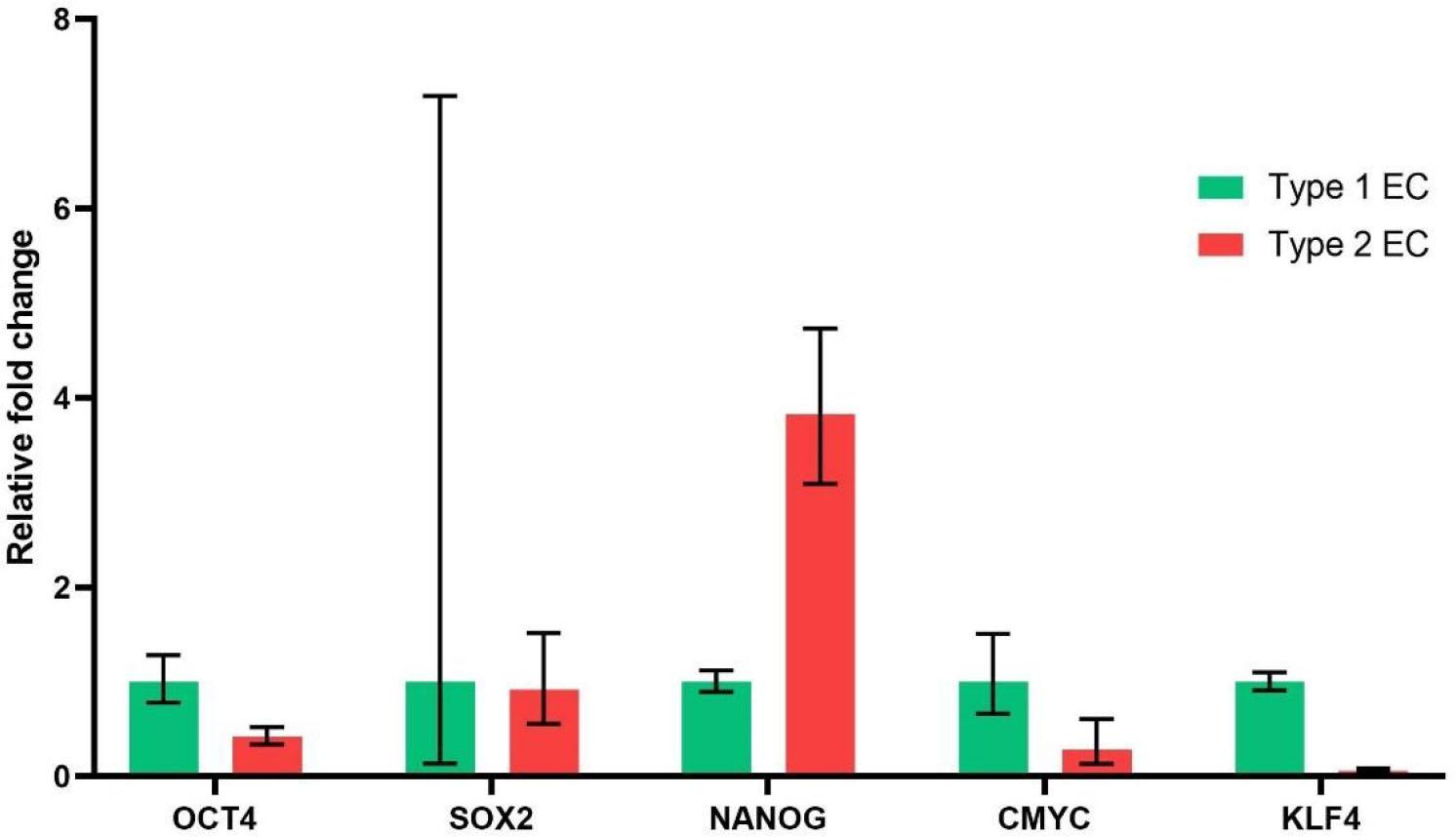Expression of transcription factors OCT4, SOX2, Nanog, KLF4 and cMYC is considered a marker of stemness. These stemness markers were abnormally expressed in different types of tumours. In addition, higher expression of these stemness markers was found to be associated with poor survival outcomes in many tumours [19]. High expression of Nanog was shown to be a stimulus for acquiring stemness and epithelial to mesenchymal transition, which is a crucial developmental process in cancer cells to obtain invasive characteristics [20]. So, we analysed the difference in expression of these stemness genes in type I and type II endometrial cancer cells obtained from patients. We observed higher expression of the Nanog gene in type II endometrial cancer cells as compared to type I endometrial cancer cells (Fig. 3). The expression of other genes related to stemness, such as OCT4 and SOX2, was found to be similar in both types of endometrial cancer. The expression of cMYC and KLF4 was found to be upregulated in type I endometrial cancer as compared to type II endometrial cancer.