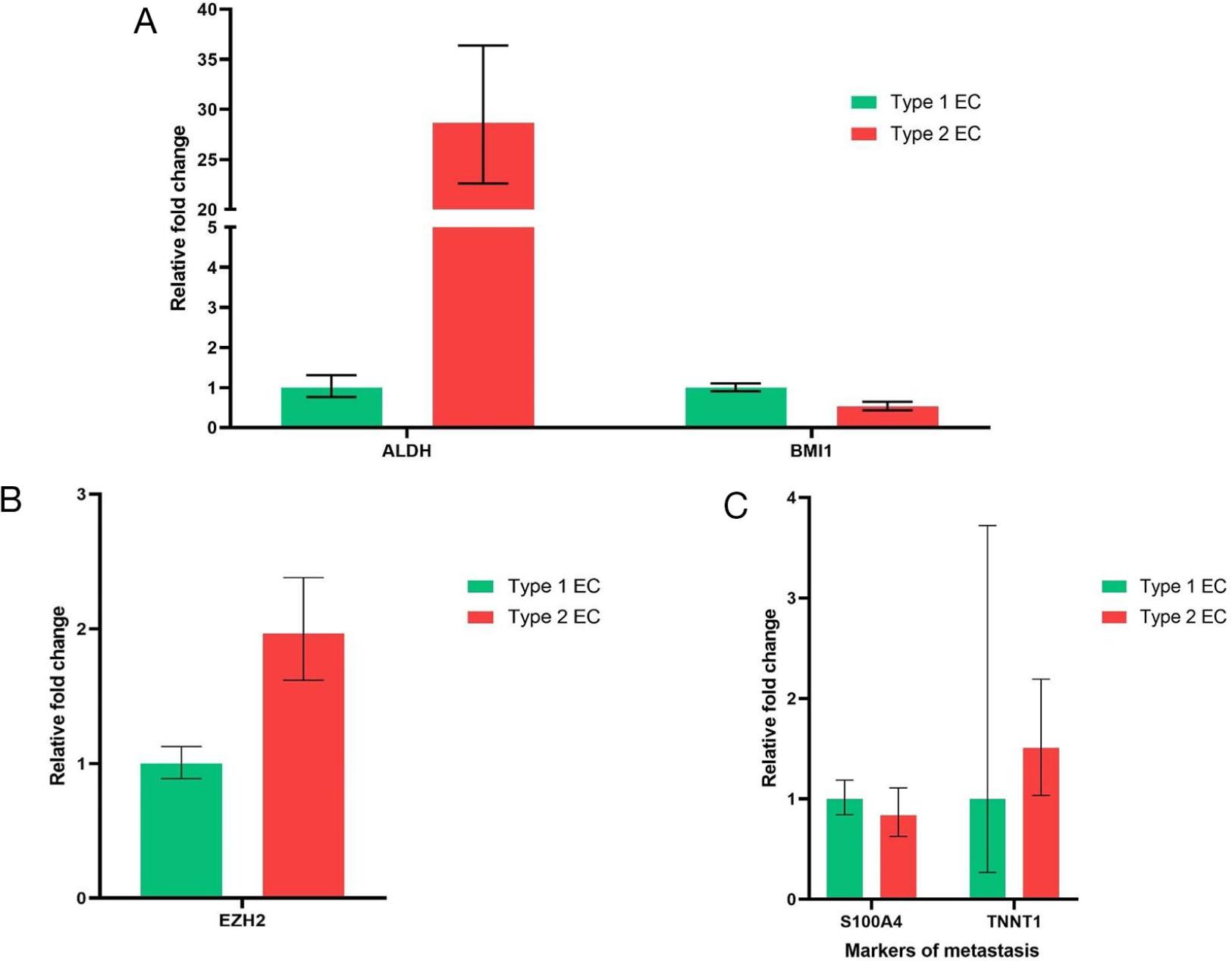 Aldehyde dehydrogenase (ALDH) enzyme is expressed in higher levels in cancer cells and cancer stem cells resistant to chemotherapy. This enzyme, being a detoxifying enzyme, can prevent the damage caused by chemotherapy to cancer stem cells [36]. As expected, the primary cells cultured from type 2 endometrial cancer patients showed much higher expression of ALDH1A1 than type 1 endometrial cancer cells. Higher expression of ALDH1A1 probably favours the survival of cancer stem cells in type 2 endometrial cancer. Also, increased expression of the ALDH1 gene is associated with poor survival outcome in endometrial cancer [37]. The epigenetic regulator polycomb group gene EZH2, which causes aberrant transcription and enhances stemness [38] in tumour tissue, was upregulated in type II endometrial cancer as compared to type I endometrial cancer. However, the markers of invasion S100A4 and TNNT1 were found to be similar in both types of cancer at this stage of disease.