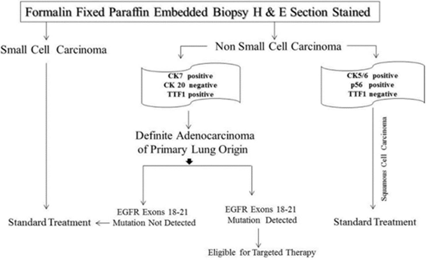 Pathologists today hold a dominant position in lung cancer treatment thanks to their relentless expertise. The therapy and prognosis of NSCLC have changed due to the identification of genetic alterations responsive to targeted therapies. Lung cancer can now be further subdivided into molecular subgroups, and there is a renewed focus on using targeted therapies for its management.[7,8] The discovery of new molecular targets, resistance mechanisms, and uncommon NSCLC genotypes will likely advance drug development and expand therapy options. As lung cancer treatment has become increasingly biomarker-driven and tailored medicines have emerged, clinical organizations must develop best practice guidelines for the type of molecular tests required according to target populations.