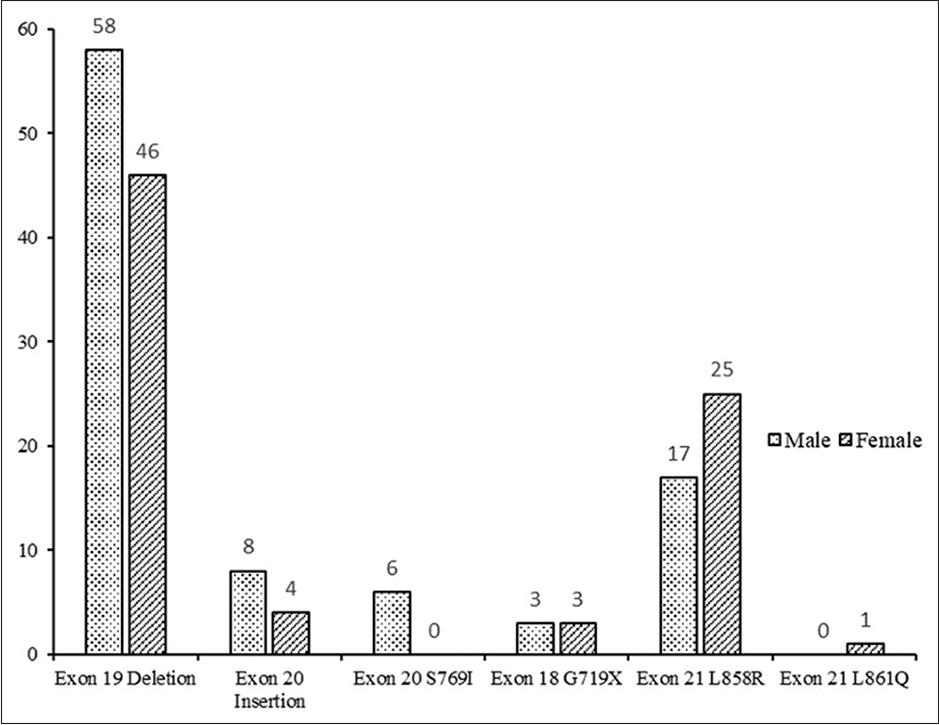 Globally, more than 2.2 million lung cancer cases were reported in 2021, making it the most frequently diagnosed cancer and the leading cause of death in cancer patients. Approximately 65% of cases were reported in males, with a maleto-female ratio of 1.8 (wcrf.org/cancer-trends/lung-cancer-statistics). In 2004, Pao et al. first reported in NSCLC adenocarcinoma oncogenic mutations in the EGFR gene, opening up a new line of therapy choices with TKIs.[12,13] Since then, many clinical trials have demonstrated the efficacy of TKIs in EGFR mutation-positive advanced NSCLC. Worldwide, it is becoming a standard of care to test for EGFR-activating mutations for identifying a subset of NSCLC patients who can benefit from tyrosine kinase-targeted therapies. Although most patients in our study were males (68.3%), the EGFR mutations were found at a statistically higher percentage in the female group compared to males (37% vs. 20%, P < 0.05). These results agree with most published studies and clinical trials, confirming that activating somatic mutations in the EGFR gene in female lung cancer patients is more common than in male patients.[14] Overall, in our study, EGFR mutations were found in 25% of the total patients.