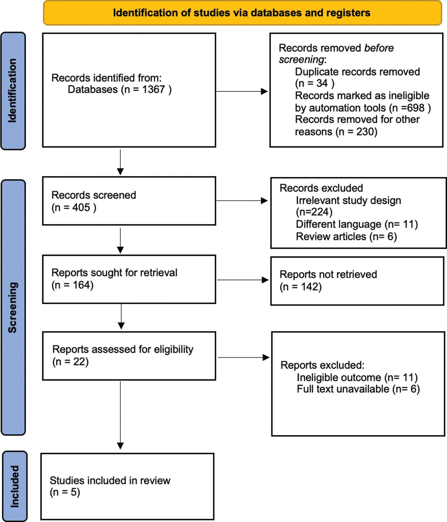 A total of 1367 articles were identified through a literature search of various databases. After removing 34 duplicate and irrelevant studies, 405 articles were screened. Of these, 164 were sorted for abstract retrieval after removing articles published in languages other than English and those with irrelevant study designs. Of these, 22 were assessed based on the full text. Finally, five studies were finalized to add to our systematic review, of which three were randomized controlled trials (RCTs), one was an ATOPE trial, and one was a retrospective cohort study. The literature search results are presented in the PRISMA flow diagram [Figure 1].