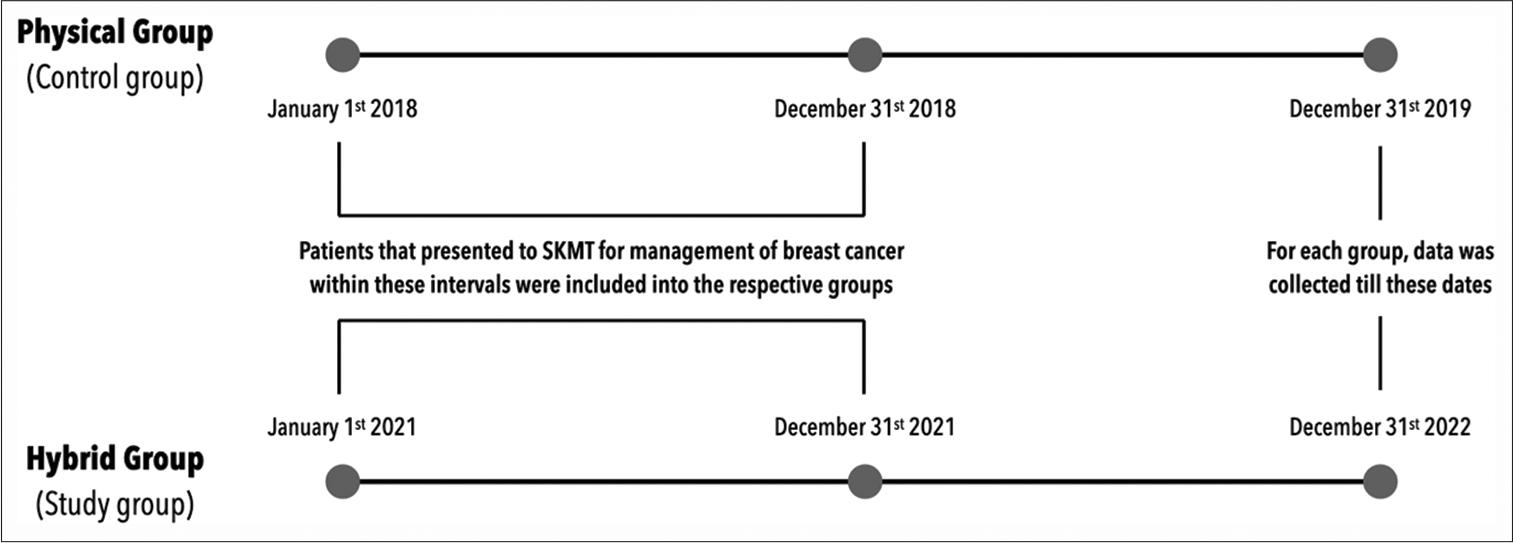 The data of all participants were de-identified. Demographic information, age, gender, body mass index, education, and diagnostic and therapeutic characteristics of breast cancer (staging, recurrence, number of chemotherapy regimens, number of surgical procedures, and radiation therapy plans) were extracted. Similarly, information on hospital admissions, including length of stay (total and in the intensive care unit), number of telemedicine and physical clinic appointments, number of visits to the EAR, history of relapse, and history of COVID-19 infection, were recorded. The endpoint of interest, final patient status, was defined as the percentage of patients alive at the end of the observation period. This variable was used as a surrogate of the clinical impact. Data were collected till December 31, 2019, for the physical group and December 31, 2022, for the hybrid group [Figure 1].