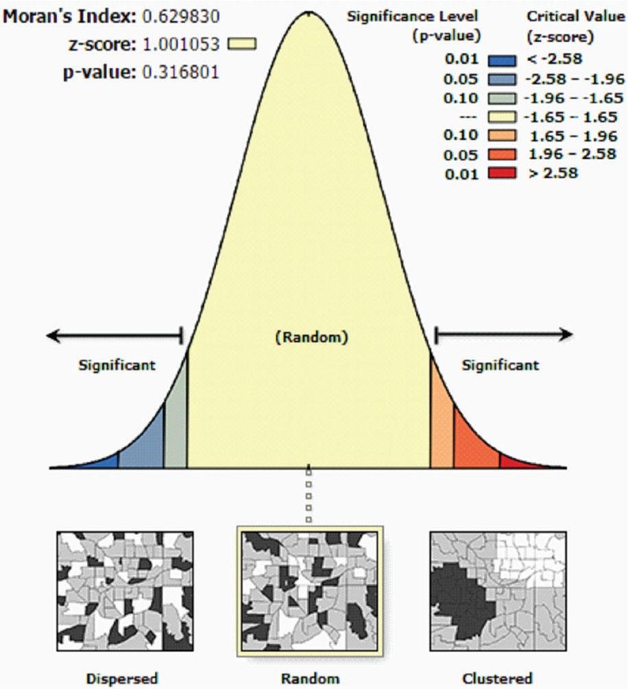 The geostatistics (spatial statistics) tool was used for autocorrelation sampling. It determines the degree to which the spatial features are either clustered or dispersed in space. This tool in ESRI’s ARC/INFO (v.10.2) software contains various indices like Moran’s I index, variance, Z-score and p-value (Figure 3). The positive and negative Moran’s I values represent cluster of data and disperse patterns respectively. The p-value is calculated from the Z-score and determines the statistical significance between the data sets and the acceptance/rejection of the null hypothesis (). Here, refers that the trees in the study area are randomly distributed.