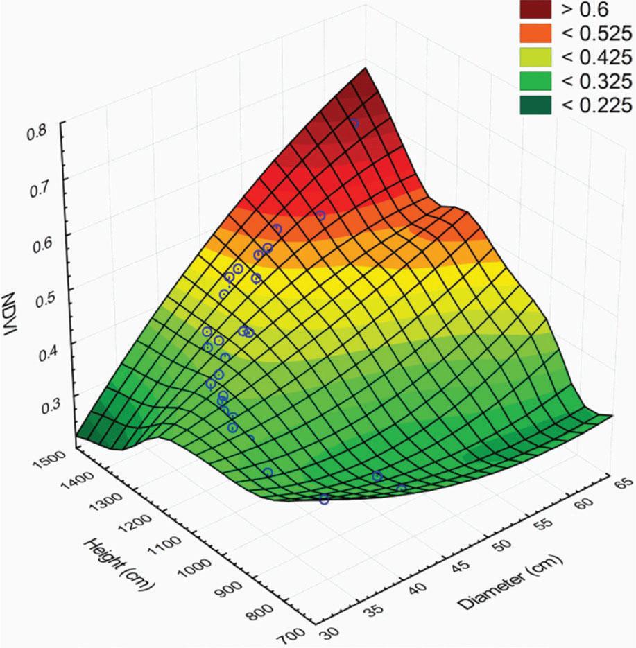 Slika 5: 3D površinski grafikon NDVI, višine dreves in prsnega premera (DBH).