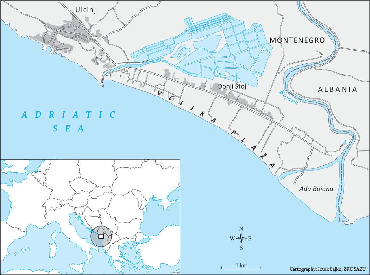 Geographic position of Velika plaža near Ulcinj (Montenegro).