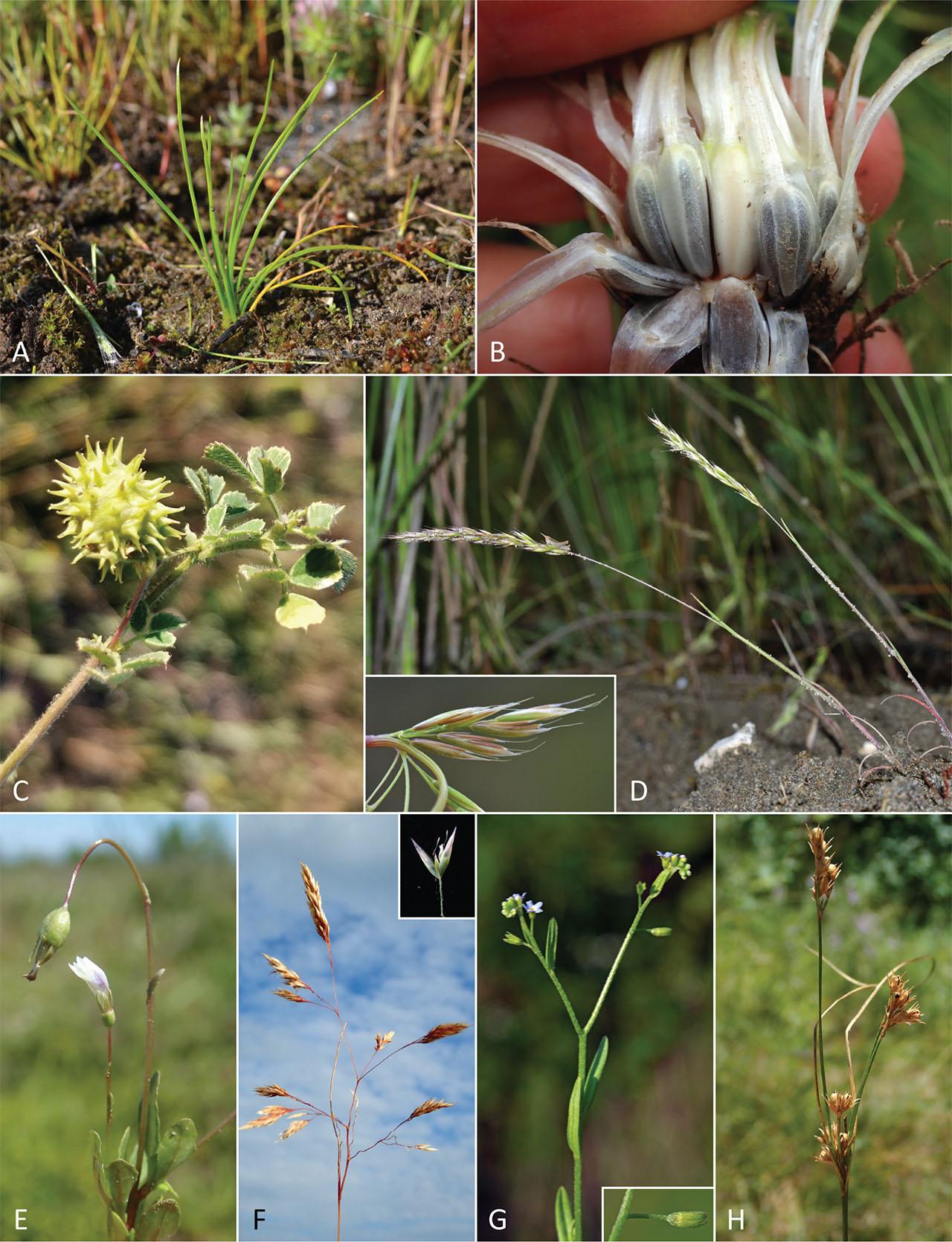 A, B – Isoetes histrix, C – Medicago doliata, D – Avellinia festucoides, E – Solenopsis laurentia ssp. gasparrinii, F – Corynephorus divaricatus, G – Myosotis laxa ssp. cespitosa, H – Juncus tenuis.