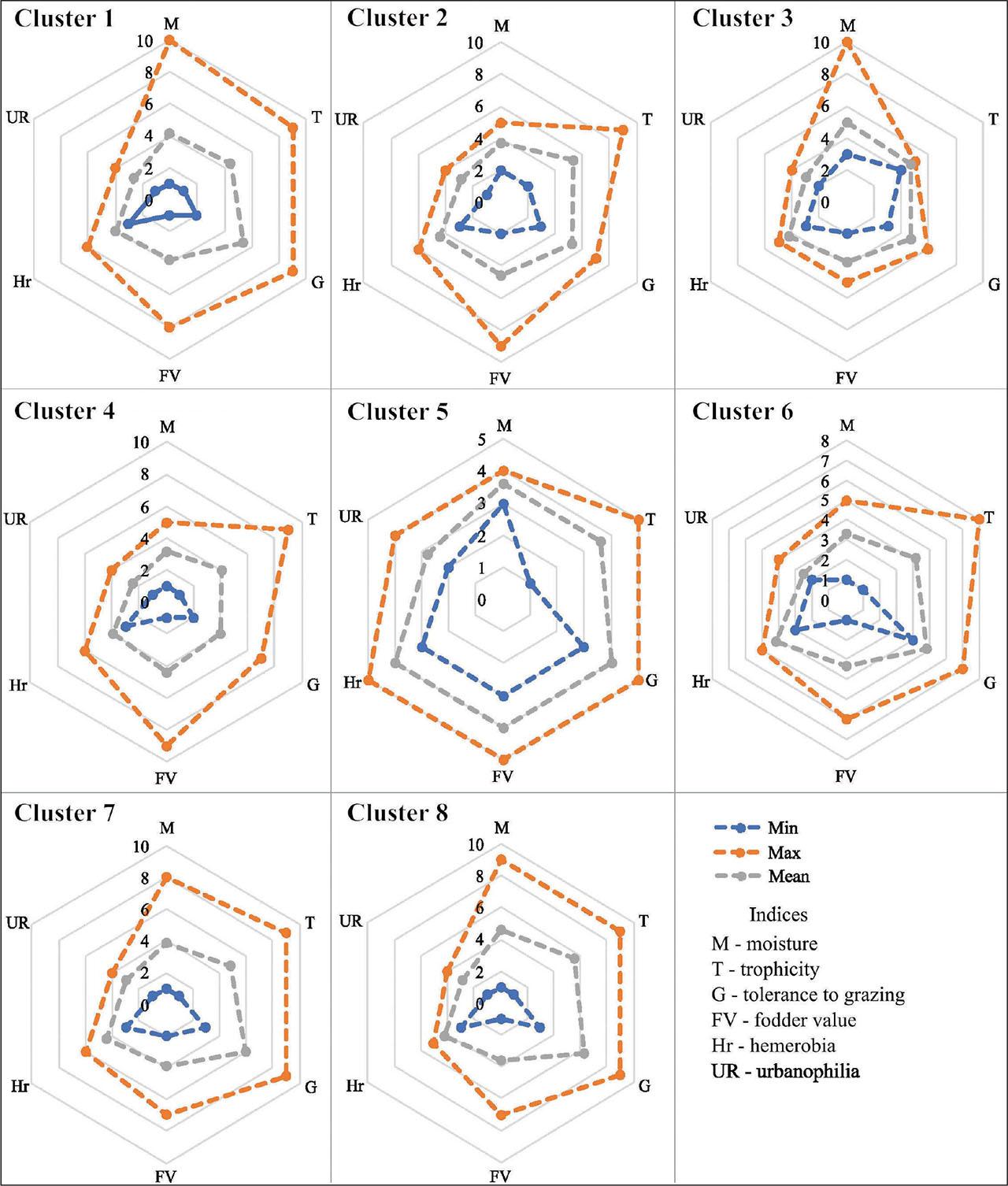 Synoptic table with the percentage frequencies of plant species in the analyzed communities_ Clusters are: cluster 1: Hordeo murini-Cynodontetum dactyloni association; cluster 2: Agropyro pectinati-Kochietum prostratae association; cluster 3: Cynodonto dactyloni-Atriplicetum tataricae association; cluster 4: Anisantha sterilis-Cynodon dactylon community; cluster 5: Bombycilaeno erecti-Bothriochloetum ischaemi association; cluster 6: Rorippo austriacae-Agropyretum repentis associations; cluster 7: Cynodon dactylon-Xanthium spinosum community; cluster 8: Rumex crispus-Xanthium spinosum community_
