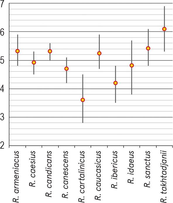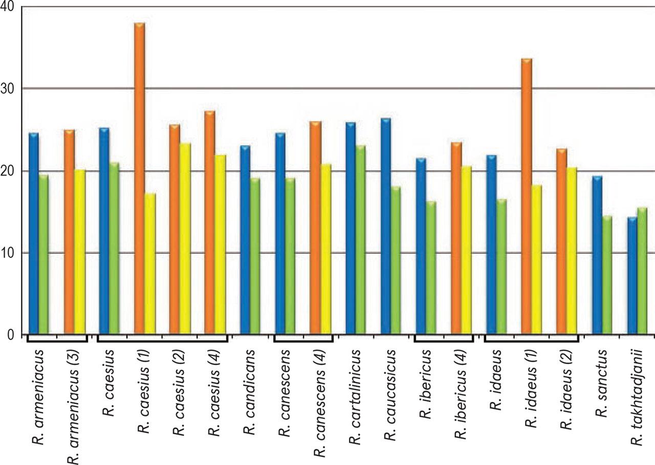 | R. armeniacus Focke | 23.5–25.8 / 24.5 ± 0.7 (2.7%) | 16.9–22.8 / 19.4 ±1.8 (9.2%) | 8/7–8/6 (subprolate) | 4.8–5.9 / 5.3 ± 0.4 (7.1%) | 8.4–12.5 / 10.4 ± 1.0 (9.8%) | finely reticulate | finely striate-perforate or finely striate-microreticulate | 28 (Krahulcová & Holub, 1997) |