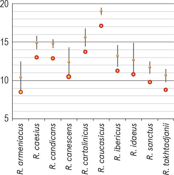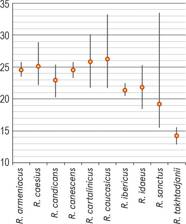 | R. caucasicus Focke | 21.7–33.2 / 26.3 ± 4.1 (15.7%) | 16.8–22.5 / 18.0 ± 3.6 (19.8%) | 8/6–8/4 (prolate) | 4.7–5.9 / 5.24 ± 0.4 (7.5%) | 18.5–19.5 / 19.0 ± 0.3 (1.7%) | granulate | finely striate-perforate | – |