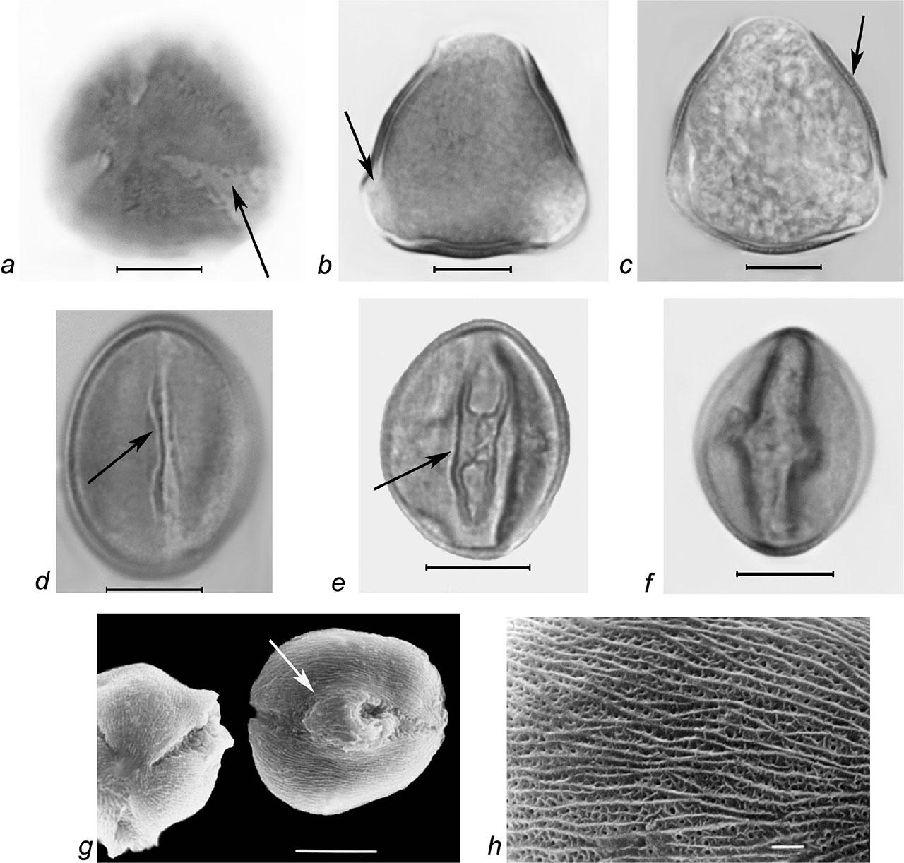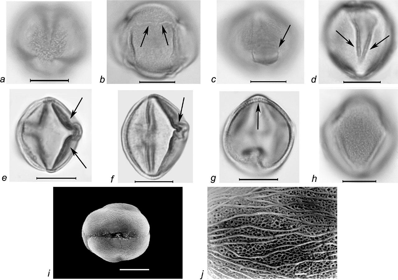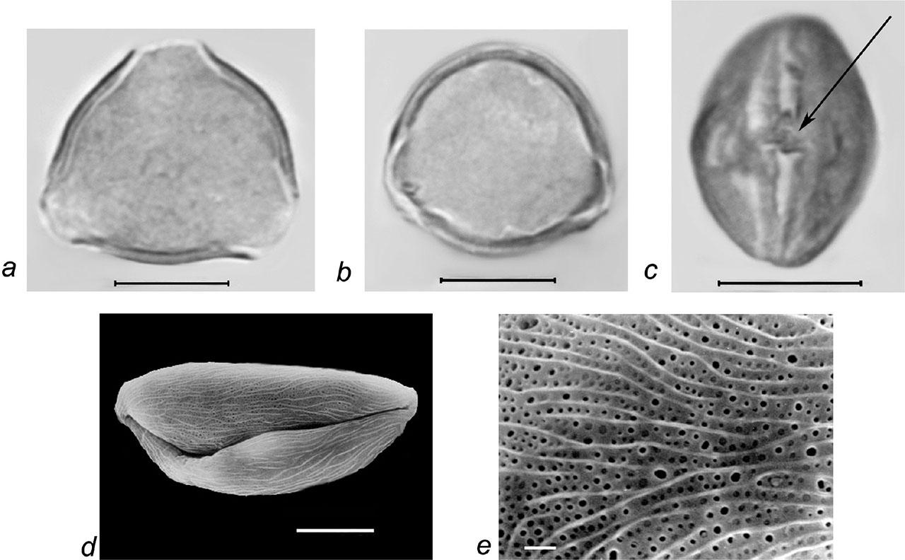 | R. cartalinicus Juz. | 21.8–30.1 / 25.8 ± 3.1 (11.8%) | 22.1–23.5 / 22.9 ± 0.5 (2.0%) | 8/8–8/7 (prolate spheroidal) | 2.8–4.5 / 3.6 ± 0.4 (11.6%) (sometimes synaperturate) | 14.4–16.8 / 15.6 ± 0.6 (3.8%) | finely striate reticulate | finely striate-perforate | – |