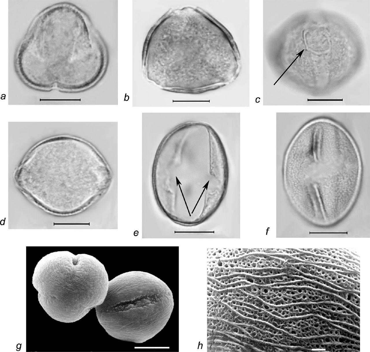 | R. ibericus Juz. | 20.5–22.5 / 21.4 ± 0.7 (3.1%) | 14.6–18.1 / 16.2 ± 1.2 (7.6%) | 8/6–8/4 (prolate) | 3.5–4.8 / 4.2 ± 0.3 (7.8%) | 11.8–14.6 / 13.2 ± 0.7 (5.3%) | finely reticulate | – | – |