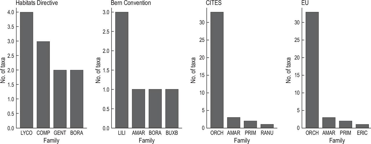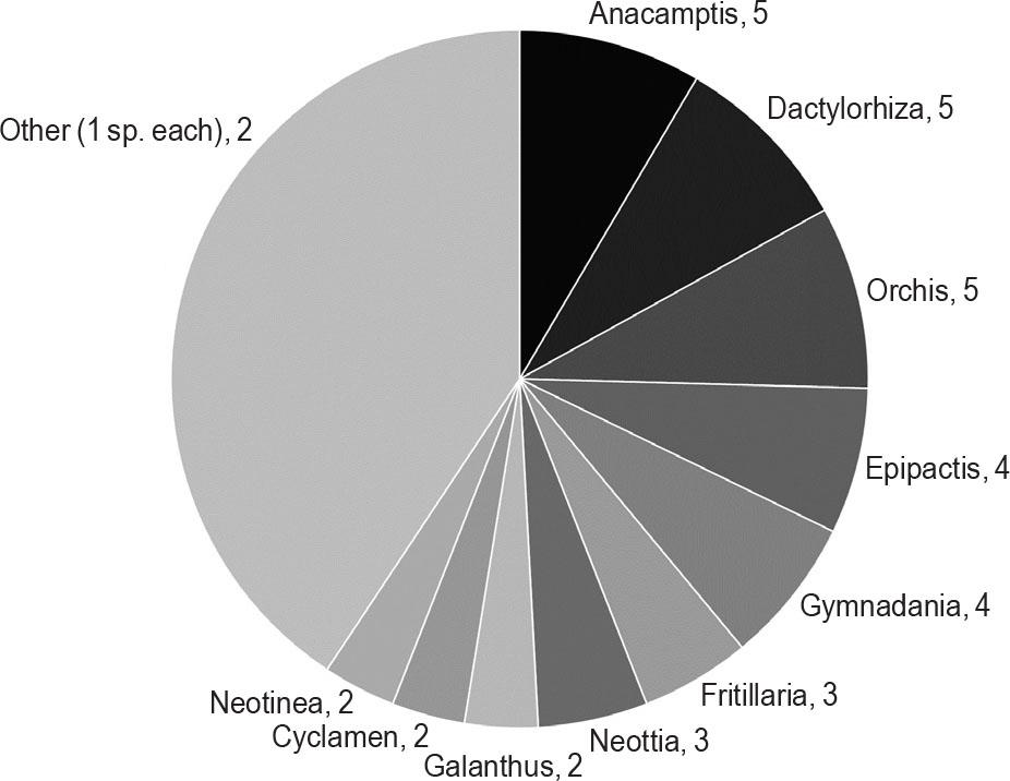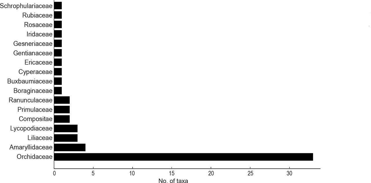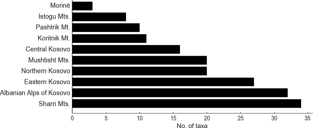 | 39 | Orchidaceae | Limodorum abortivum (L.) Sw. | - | - | II | B | LC - | Infrastructure, over-collection, grazing, habitat fragmentation | Montane pasture slopes and pine forest clearings and vicinities, Pannonian woods with Quercus pubescens | Ibër river banks (Mitrovicë), Albanian Alps (Gryka e Rugovës, Koprivnik, Maja e Vjellakut), Firajë (foothill of Luboten Mt.), Luboten Mt. |