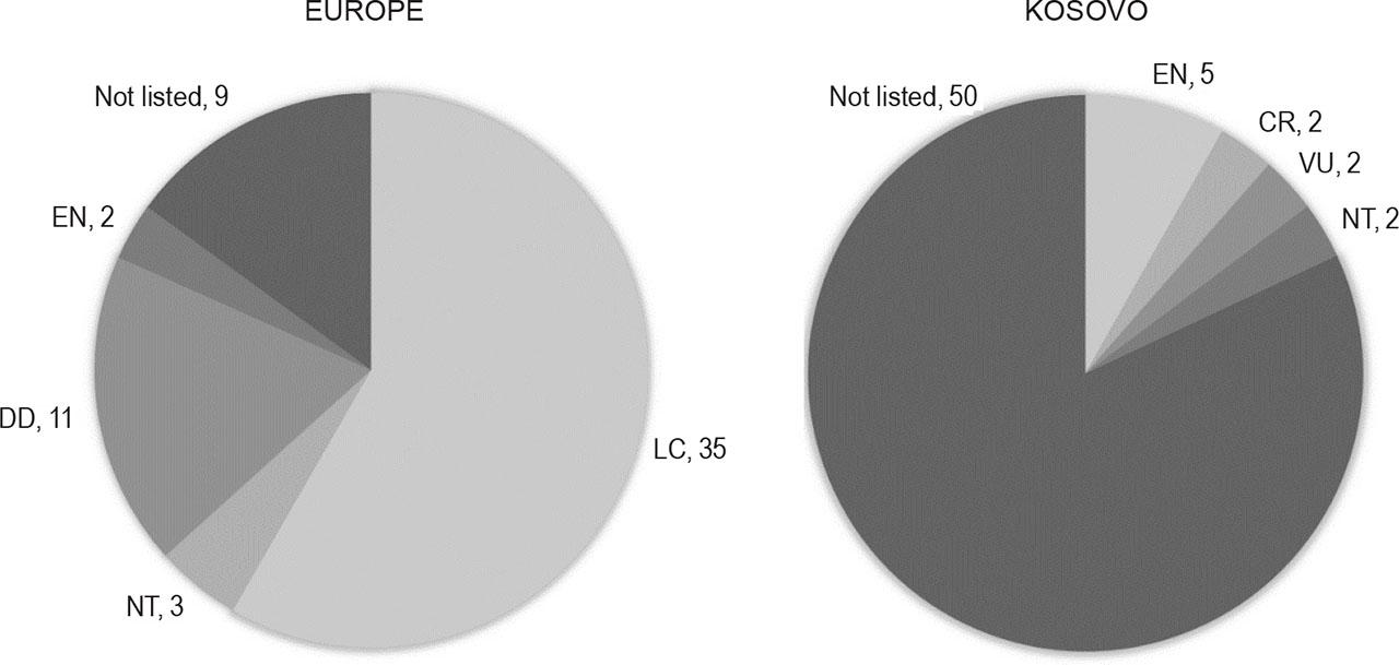 | 41 | Amaryllidaceae | Narcissus poeticus subsp. radiiflorus (Salisb.) Baker | - | I | - | - | DD - EN | Over-collection – due to its ornamental properties | Wet meadows of lowland to mountain regions | Kaçanik, Dumnicë, Ferizaj, Artanë, Dobroshec, Fushë Kosovë, Albanian Alps of Kosovo (Maja e Vjellakut, Llaz Bellopaç, Rugovë), Brezovicë, wd+ |