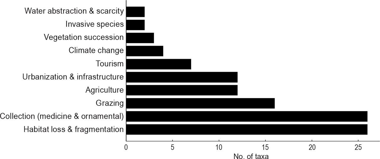 | 8 | Compositae | Artemisia umbelliformis subsp. eriantha (Ten.) Vallès-Xirau & Oliva Brañas | V | - | - | - | EN | Skiing, cycling, tourism – habitat degradation | Siliceous rocky slopes and crevices | Albanian Alps of Kosovo (Gjeravicë), Sharri Mts. (Luboten, Livadhishtë, Shtëpi e Malorëve) |