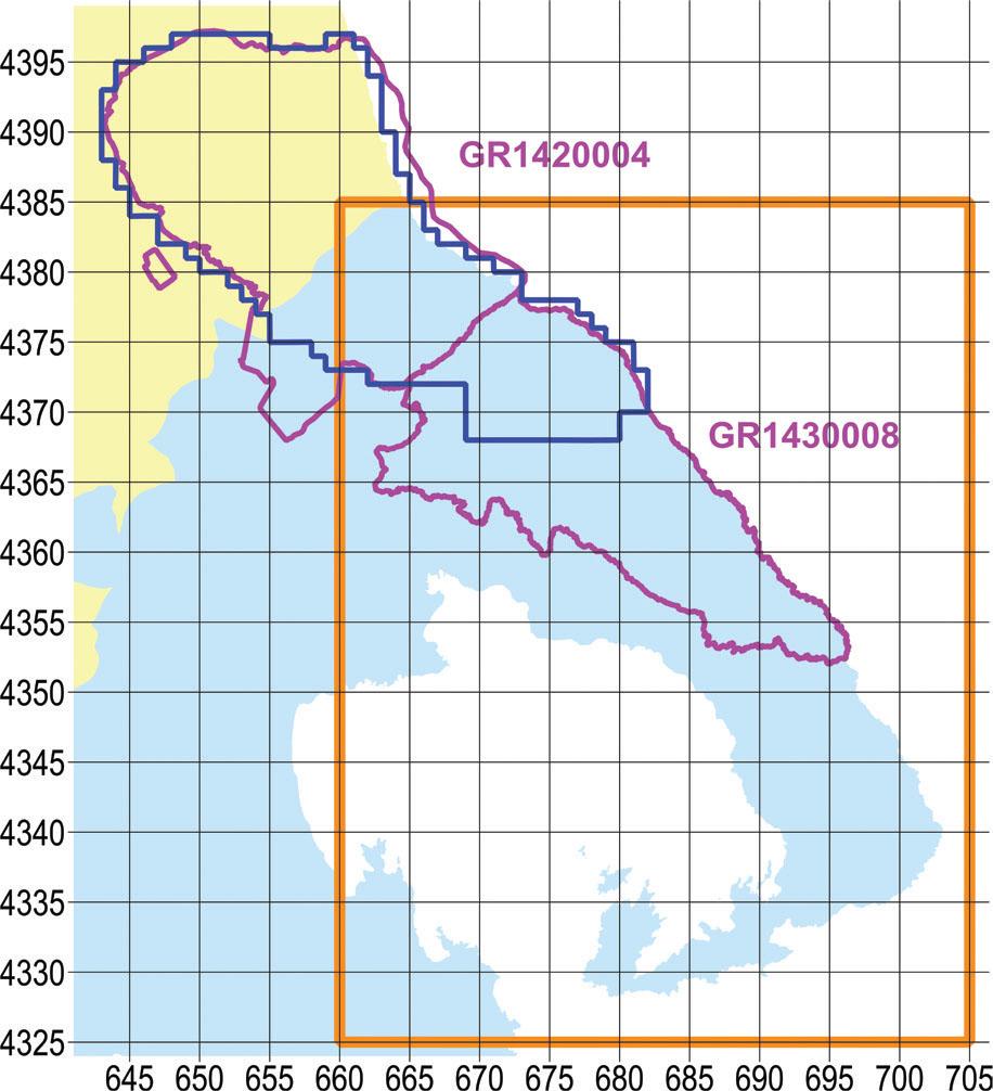 Slika 1: Zemljevid širšega preučevanega območja. Z rumeno je označena prefektura Larissa, s svetlomodro pa prefektura Magnesia, s škrlatno barvo obe območji Natura 2000, s temno modro barvo je označeno ožje preučevano območje in z oranžno preučevano območje v članku Biel & Rudolph (1992). Velikost kvadrantov UTM mreže je 5 km.