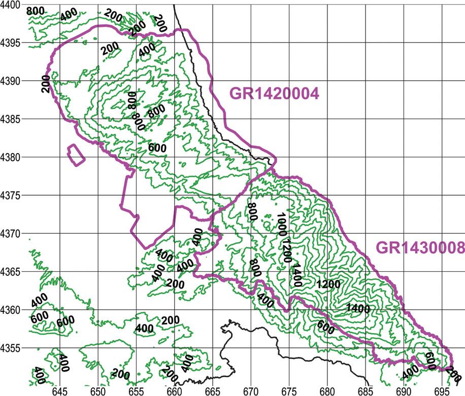 Elevation map of the two Natura 2000 sites, outlined in magenta. Contour interval 200 m, UTM grid spacing 5 km.