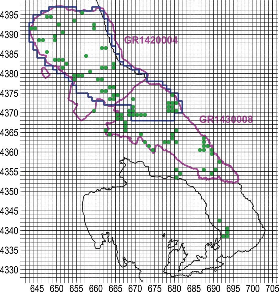 Map with sampling units 1 km wide that yielded orchid findings within the broader study area during 2021–2022. With magenta outline the two Natura 2000 sites, with dark blue the outline of the narrow study area. UTM grid spacing 1 km.