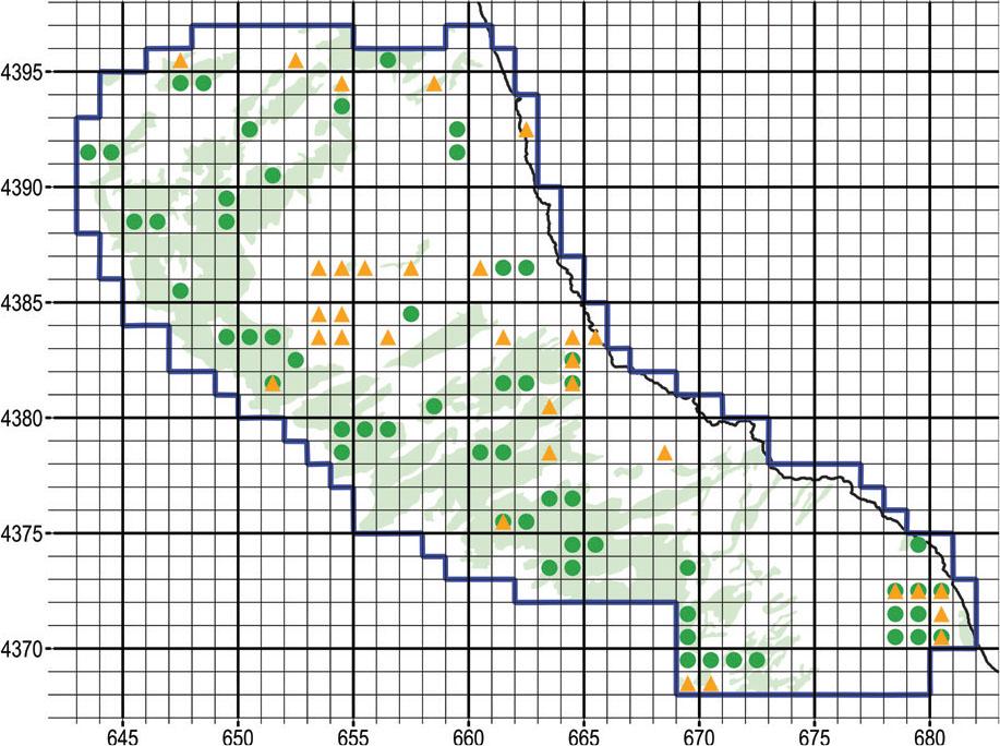 Slika 6: Zemljevid kvadrantov velikosti 1 km, kjer smo v letih 2012–2022 našli orhideje v večjem preučevanem območju. Zelene točke predstavljajo naše najdbe, oranžni trikotniki so podatki iz Flora Hellenica Database, predvsem pred letom 1992. Velikost kvadrantov UTM mreže je 1 km.