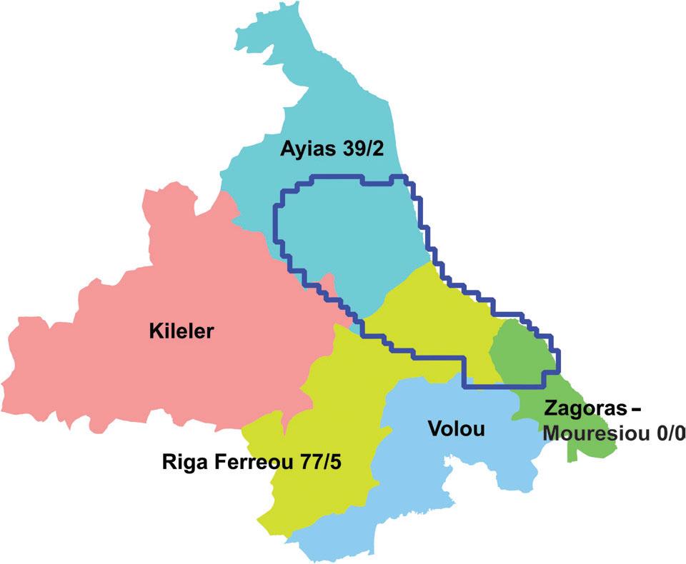 Slika 12: Ožje preučevano območje, označeno s temno modro, sega v občine Ayia, Riga Ferreou in Zagora-Mouresi. Številke ob imenu občine so seštevki malih prežvekovalcev/goveda v tisočih glav.