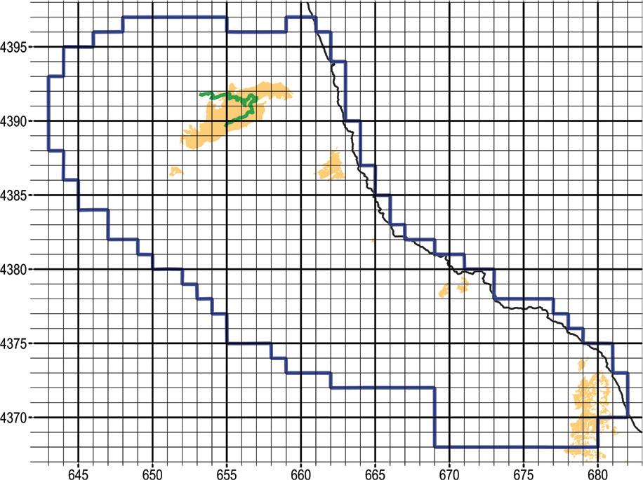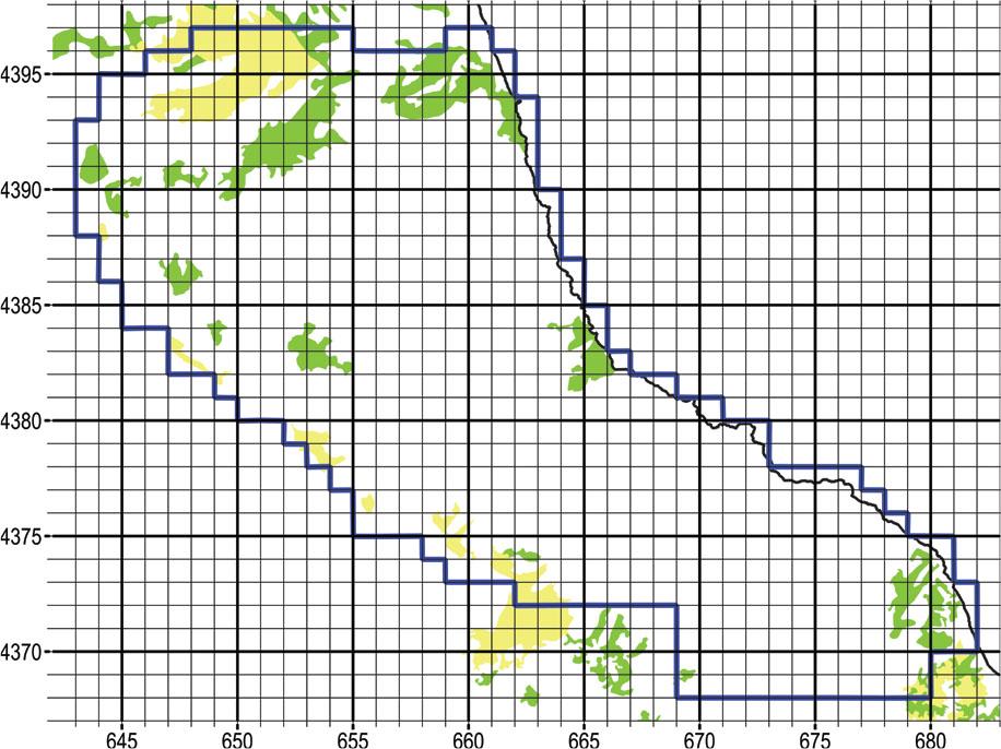Yellow fill indicates Corine Land Cover class “2.2.2 Fruit trees and berry plantations”. Green fill indicates class “2.4.3 Land principally occupied by agriculture, with significant areas of natural vegetation.” At the N and the SE part of the narrow study area, these two classes correspond primarily to apple orchards that may be interspersed with patches of natural vegetation. UTM grid spacing 1 km.