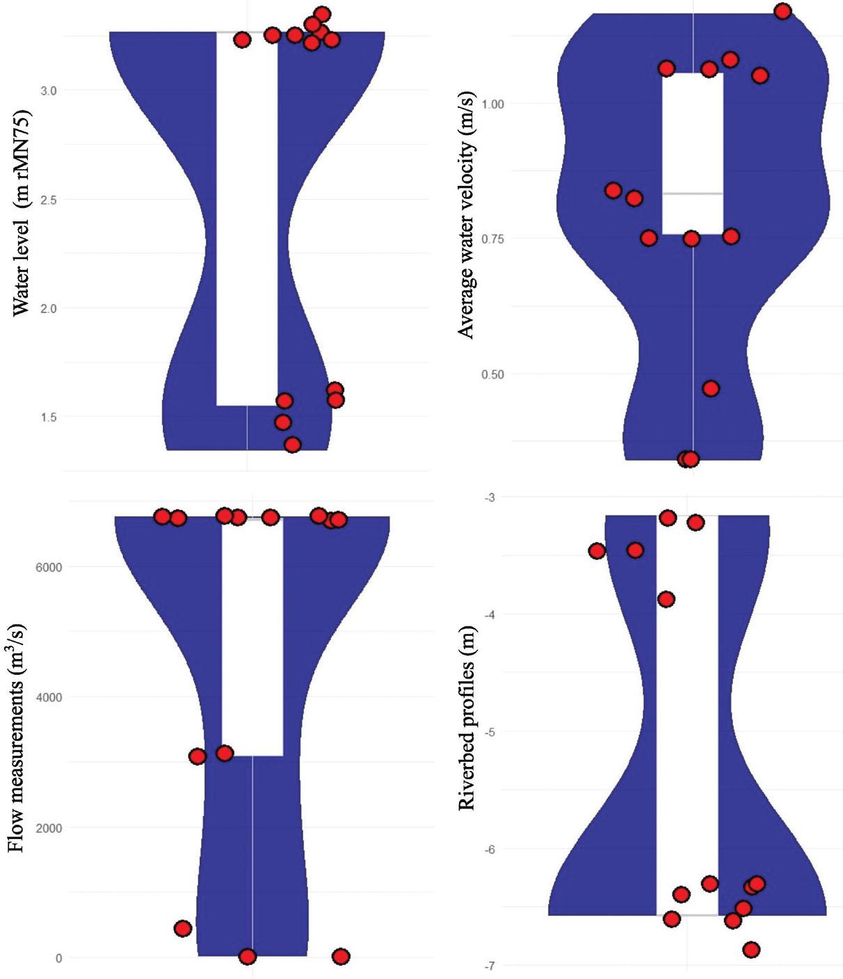 In the study, bathymetric measurements were made using the SonTek RiverSurveyor M9 equipment, mounted on a HydroBoard II. The equipment uses acoustic pulses to determine water velocity, depth, flow, and riverbed elevations based on advanced technology. Multiple acoustic frequencies ensure accurate measurements at shallow and deep depths, even while moving. Data were collected on longitudinal and transverse sections at distances of 100–150 m and in critical areas at 50 m to obtain a detailed representation of the riverbed profile. The equipment features GPS RTK for precise real-time positioning (±3 cm), transmitting and correcting data via Bluetooth. The equipment’s compass was calibrated to compensate for magnetic interference, and the sensors were positioned upstream of the boat’s engine to avoid the influences of vibrations and propeller-generated currents (Sočuvka, 2024). For accuracy, additional topographic measurements were also performed using the Spectra Precision SP80 GPS and the LEICA NA 524 optical level to validate the water level. The collected data provides detailed information on the bathymetric profile, current velocity, and discharge of the riverbed’s cross-sections, ensuring a general picture of the hydrological parameters of the studied area. Violin plots of hydrological factors were produced in R Statistical Software (v4.1.4; R Core Team 2024) via ‘ggplot2’ v.3.5.1 (Wickham, 2016).
