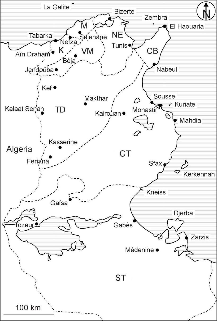 Regions and main cities of Tunisia. CB, Cap Bon; TD, Tunisian Dorsal; K, Kroumiria; M, Mogods; NE, Northeast; VM, Valley of Medjerda; CT, Central Tunisia; ST, Southern Tunisia.
