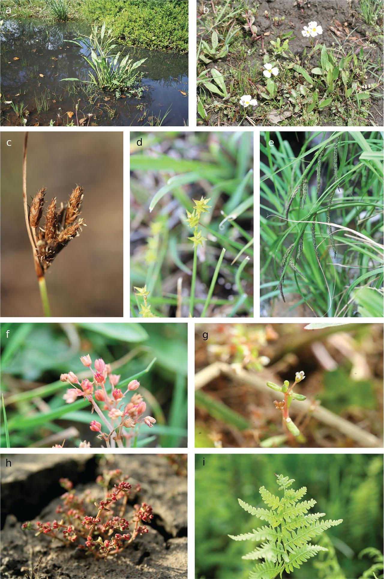 Slika 2: Nekateri novo zabeleženi taksoni: a, Alisma lanceolatum (Garâa Sejenane, 5.5.2007); b, Baldellia repens subsp. repens (Majen el Ma, 27.5.2009); c, Bolboschoenus glaucus (Garâa Sejenane, 4.5.2008); d, Carex echinata (Jbel Ghorra, 10.5.2023); e, Carex panormitana (Beni M’Tir, 5.5.2017); f, Crassula decumbens (Garâa Sejenane, 30.4.2013); g, Crassula helmsii (Garâa Sejenane, 8.5.2014); h, Crassula vaillantii (Garâa Sejenane, 20.4.2008); i, Thelypteris palustris (Ouchtata, 3.5.2013).