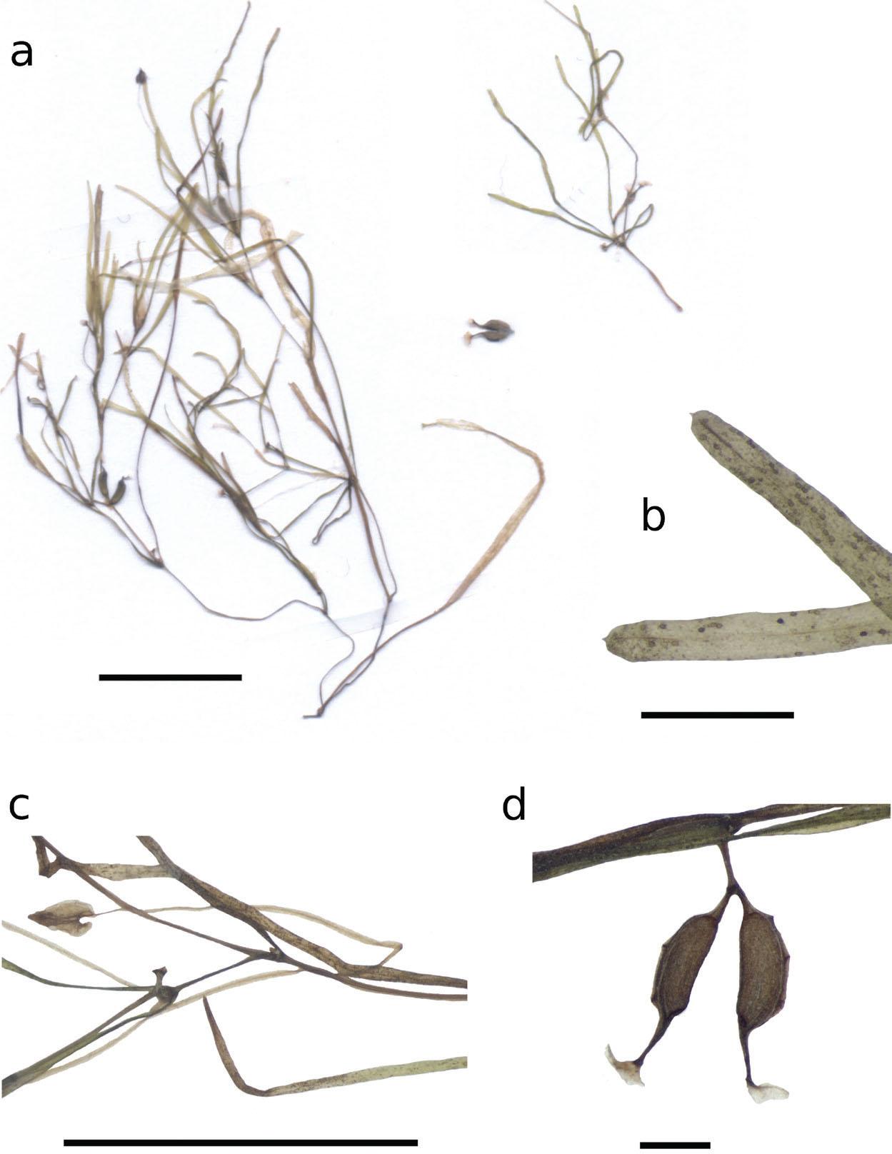 Slika 3: Podrobnosti vrste Zannichellia obtusifolia (Kantaret Binzart, 30.4.2023). a, celotna rastlina z ločenim ženskim cvetom; b, topo zaobljen vrh listov; c, moški cvet s celotnim prašnikom, sestavljenim iz prašnic na dolgi prašnični niti (> 1 cm); d, plodni listi z membranasto brazdo v obliki lija. Merilo predstavlja 1 cm (a, c) in 1 mm (b, d).