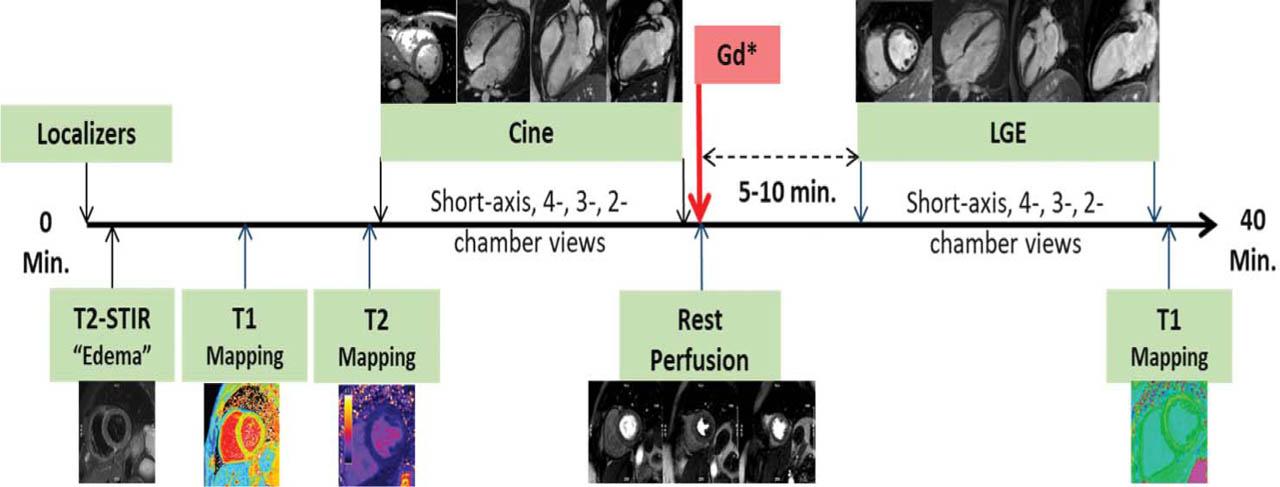 Schematic exemplification of a rest CMR protocol used in the work-up of patients with non-ischemic and inflammatory cardiomyopathies, including functional (cine), rest contrast myocardial perfusion and tissue characterization: T2-STIR, T2-mapping, pre- and post-contrast T1-mapping, and late gadolinium enhancement (LGE) sequences. * - 0.15 mmol/kg.