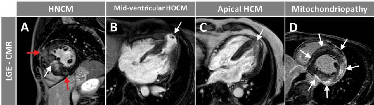 Exemplary LGE images in three patients with different forms of hypertrophic cardiomyopathy (HCM) (A, B, C) and in one patient with inherited primary mitochondrial disease (D). In the first case, with non-obstructive HCM (A), a typical, non-ischemic, patchy LGE in the hypertrophied septum (white arrow) together with focal LGE in the RV insertion points (red arrows) is present. In the second case, with mid-ventricular obstructive HCM (B), transmural LGE with apical aneurysm formation and small apical thrombus can be noticed (white arrow). In the third case, with apical HCM (C), diffuse, non-ischemic LGE in the hypertrophied apical segments can be depicted (white arrow). Lastly, in the mitochondriopathy patient (D), extensive, circular, subepicardial/intramural (non-ischemic) LGE (white arrows) and concentric LV hypertrophy are seen.