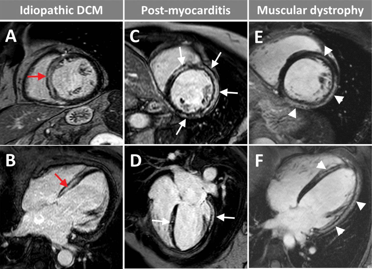 Exemplary LGE images in three patients with dilated cardiomyopathy (DCM). In the first case, with idiopathic DCM (A), a characteristic, mid-wall (non-ischemic) LGE is seen in the basal and mid-ventricular septum (red arrows). In the second case, with post-inflammatory (myocarditis) DCM, a typical, almost “ring-like” subepicardial/intramural (non-ischemic) LGE in the basal and mid-ventricular segments can be depicted (white arrows). In the third case, with Becker muscular dystrophy and cardiac involvement, extensive LGE with a myocarditis-like pattern is present (arrow heads).