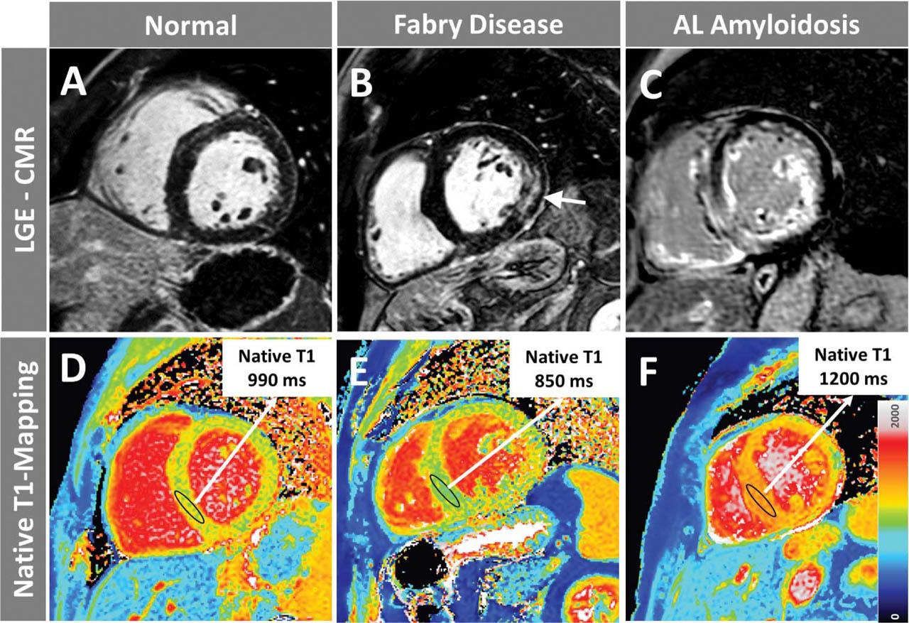 Exemplary LGE images and corresponding, color-coded native T1 maps (no contrast needed) in a normal control and in two patients with hypertrophic phenotypes. In the first case, with Anderson-Fabry cardiomyopathy, a reduced septal native T1 time (where fibrosis is absent) due to lipid accumulation together with characteristic intramural fibrosis (LGE) in the basal lateral wall (white arrow) can be seen. In the second case, with AL cardiac amyloidosis, an elevated native T1 myocardial time together with extensive, almost circular LGE, more pronounced in the subendocardium and involving also the RV (septum and inferior wall) can be depicted.
