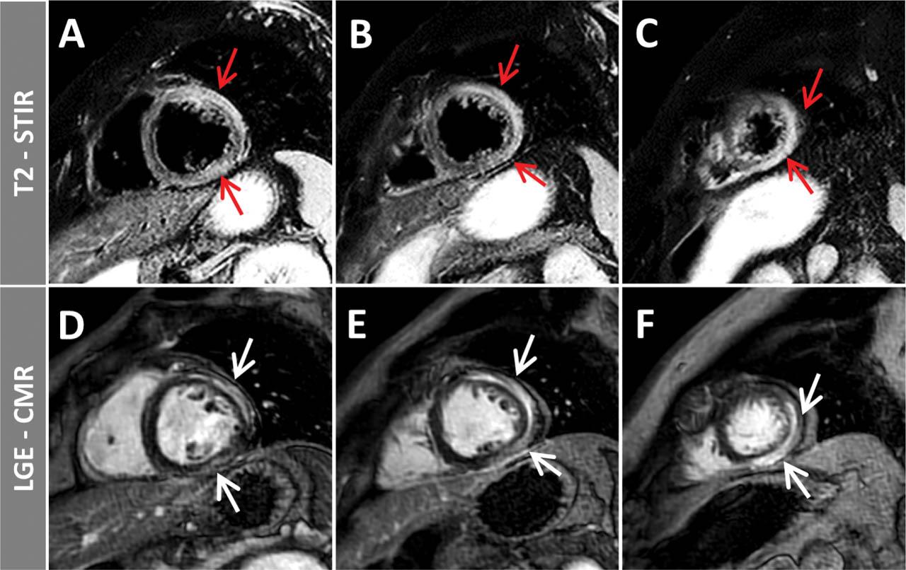 Edema sensitive T2-STIR (A, B, C) and LGE images (D, E, F) in a patient with acute viral myocarditis. Acute, non-ischemic, inflammatory changes with edema (T2-hyperintensity, red arrows) and LGE (white arrows) in the subepicardium of the inferior and lateral walls, extending towards the anterior wall, can be noticed.