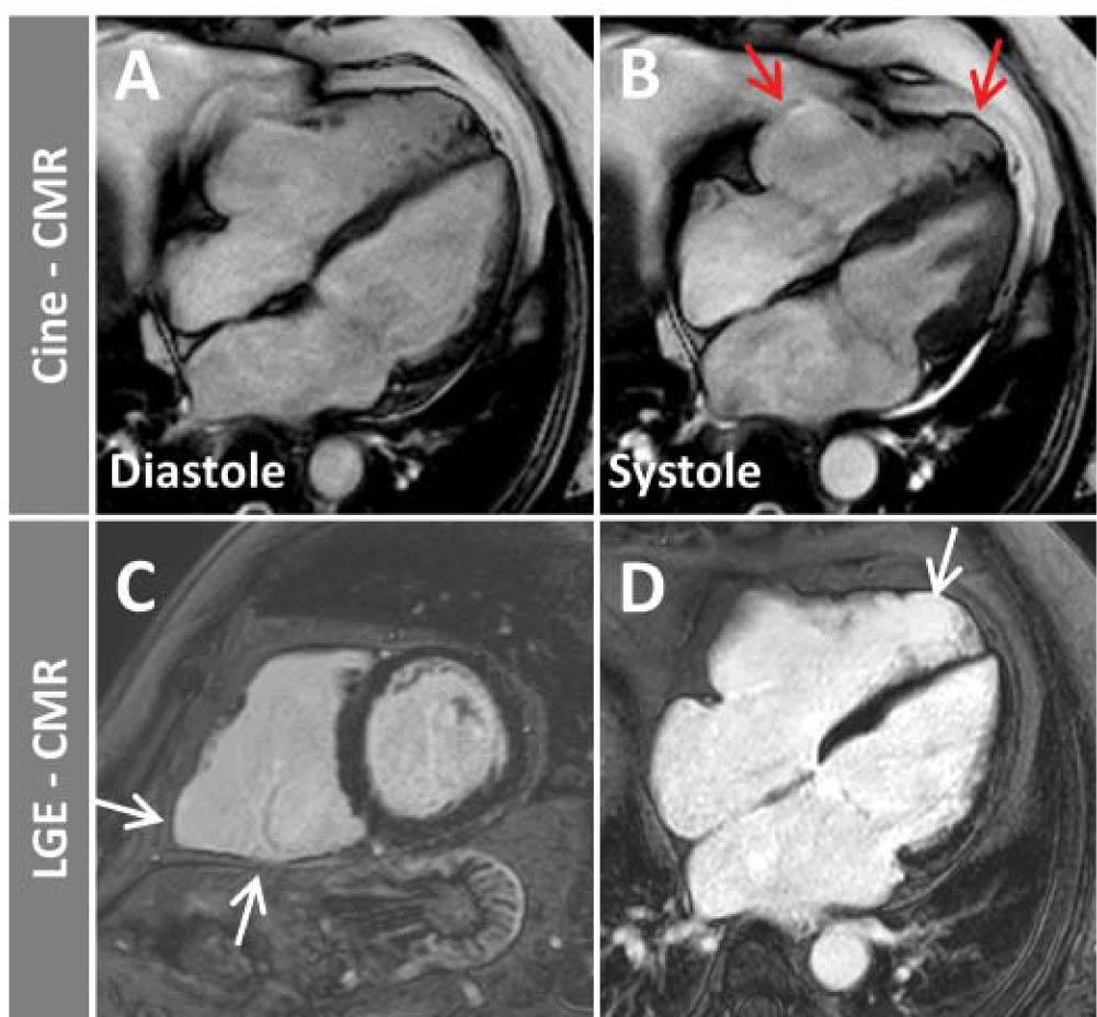 Cine images at end-diastole (A) and end-systole (B) as well as LGE images in basal short-axis (C) and four-chamber view (D) in a patient with arrhythmogenic RV cardiomyopathy. A dilated RV with dys-kinetic basal and apical lateral wall (B, red arrows) and corresponding fibrotic changes (LGE) in the basal inferior/lateral and apical lateral RV walls (C, D, white arrows) can be seen.
