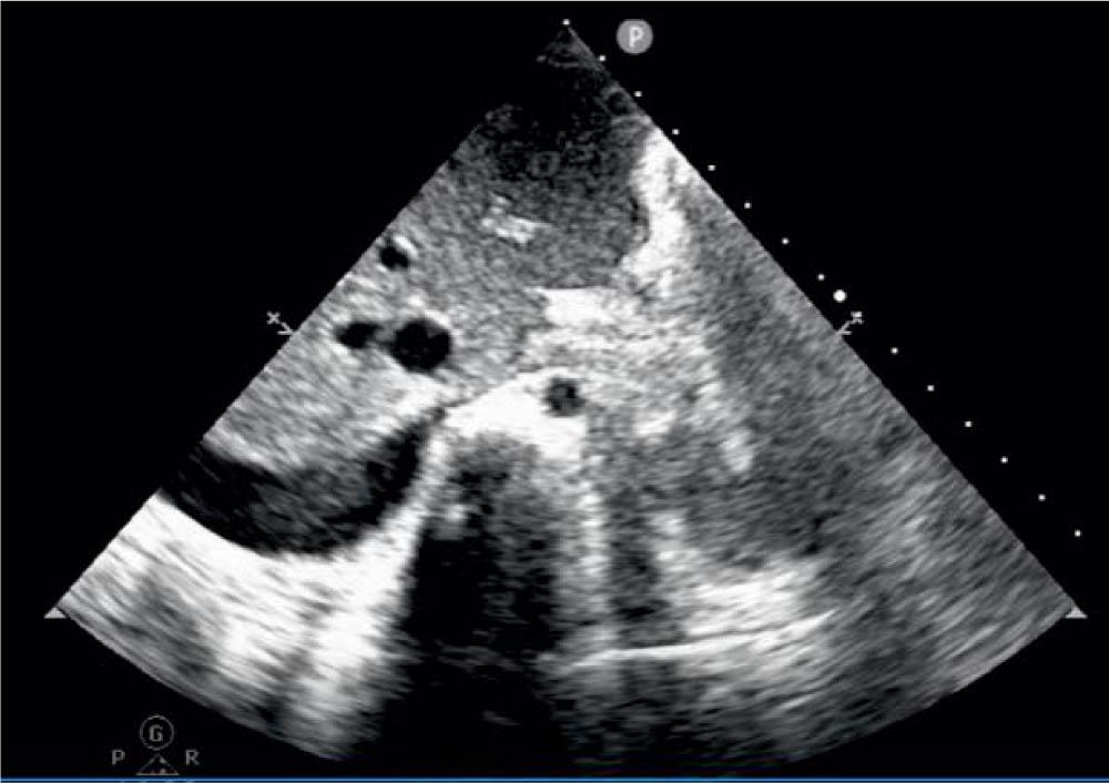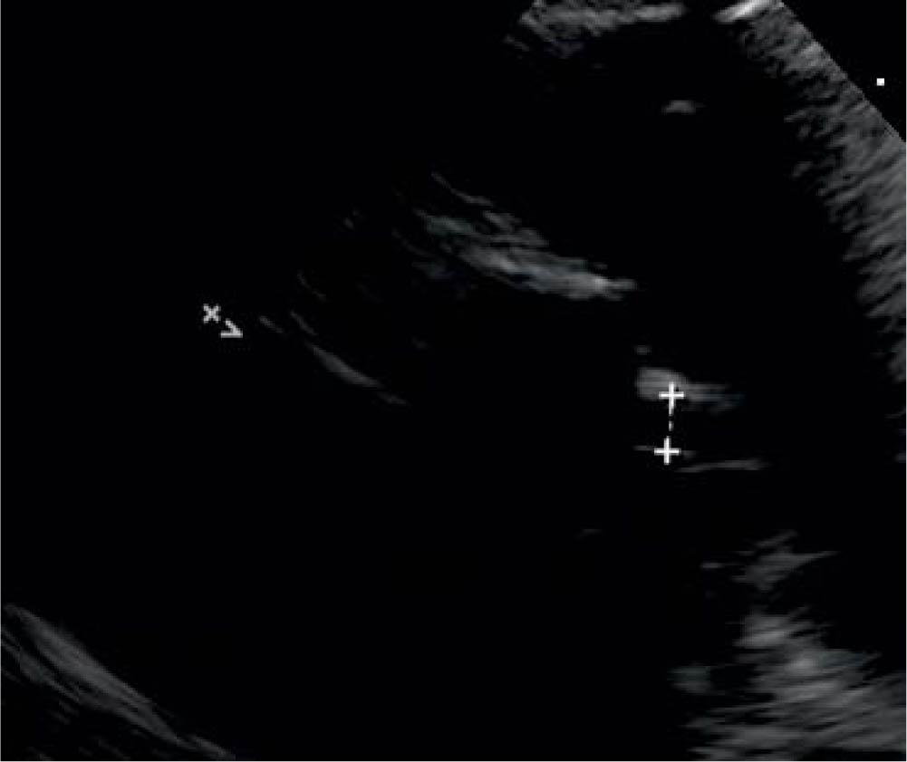 The electrocardiogram was normal. Repeated transthoracic echocardiography confirmed the moderate-severe systolic dysfunction (LVEF = 30–40%), the thin layer of pericardial effusion, a right pleural effusion of about 16 mm, Figure 1, mild mitral regurgitation, Figure 2, initial normal coronary artery diameter, but in evolution, in the fifth day dilated coronary arteries were noticed - the left main coronary artery measured 3.4 mm (Z-score = 2.8), the left anterior descending coronary artery measured 2.5 mm (Z-score = 2.6), and the right coronary artery was of normal size 2 mm (Z-score = 0.6) (Figure 3).