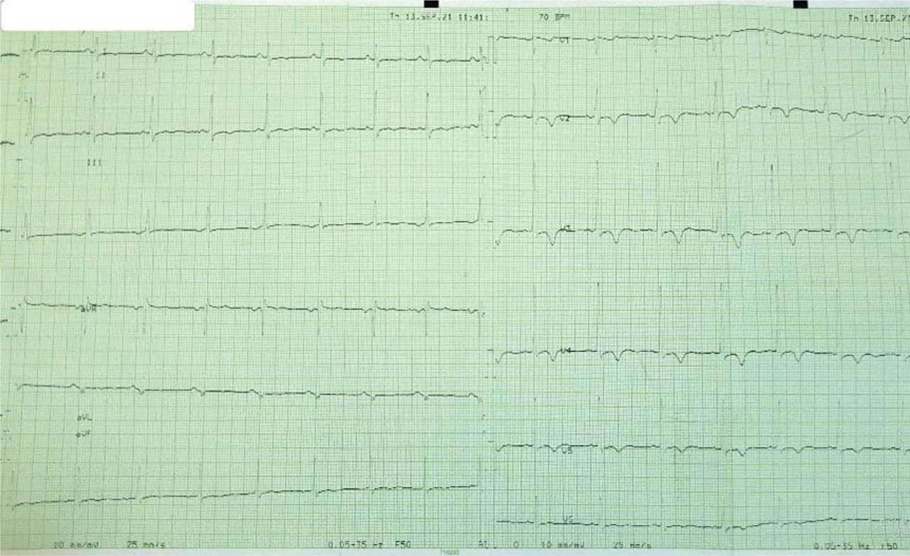 ECG: sinus rhythm, normal QRS axis, minor right bundle branch block and inverted T waves in DI, aVL, V2–V6.