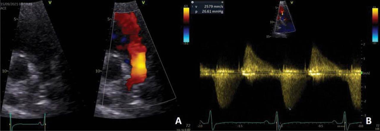 Transthoracic echocardiography modified parasternal short axis view. (A) 2D and color Doppler examination: large colour-flow pulmonary regurgitation jet width suggestive for severe pulmonary regurgitation. (B) CW Doppler examination: dense, steep deceleration of pulmonary regurgitation jet CW signal, with a pressure half time of 98 ms, suggestive for severe pulmonary regurgitation; peak antegrade velocity 2.6 m/s, peak antegrade gradient 26 mmHg, suggestive for large residual pulmonary stenosis.