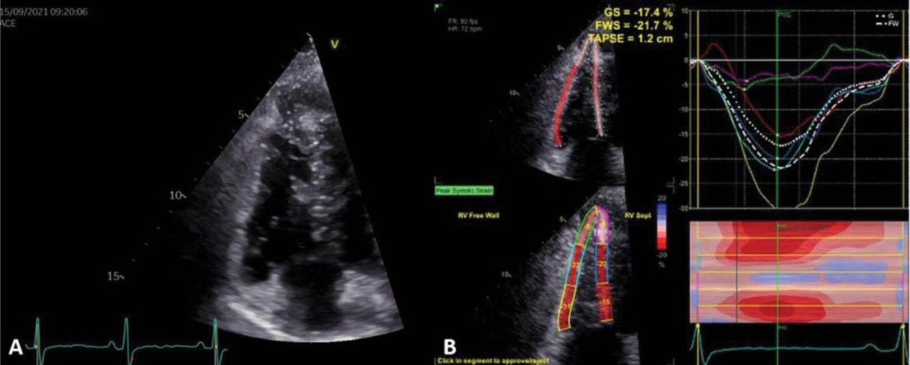 (A) Transthoracic echocardiography, apical RV-focused: normal size RV (B) Transthoracic 2D speckle-tracking echocardiography: slightly reduced RV longitudinal strain.