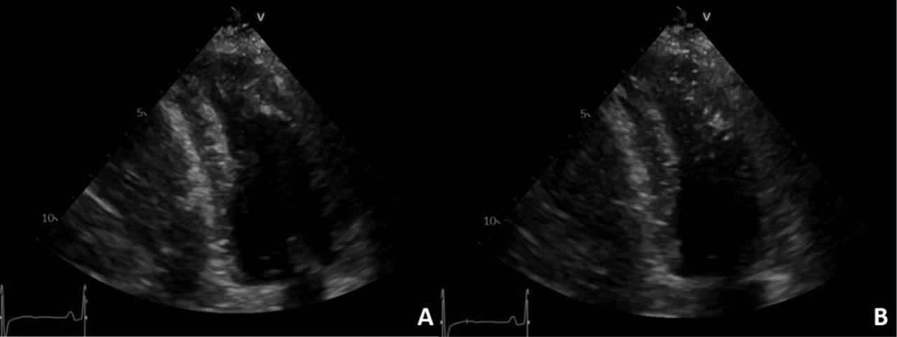 Transthoracic echocardiography, apical 2-chamber view, 2D examination: left ventricular apical hypertrophy in diastole (A) with systolic obstruction at this level (B).