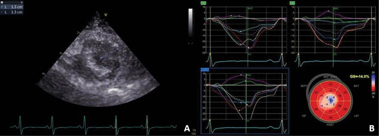 (A) Transthoracic echocardiography, short-axis view of the apex, 2D examination: left ventricular apical hypertrophy. (B) Transthoracic 2D speckle-tracking echocardiography: paradoxical strain of the left ventricular apex suggestive of hypertrophic cardiomyopathy.