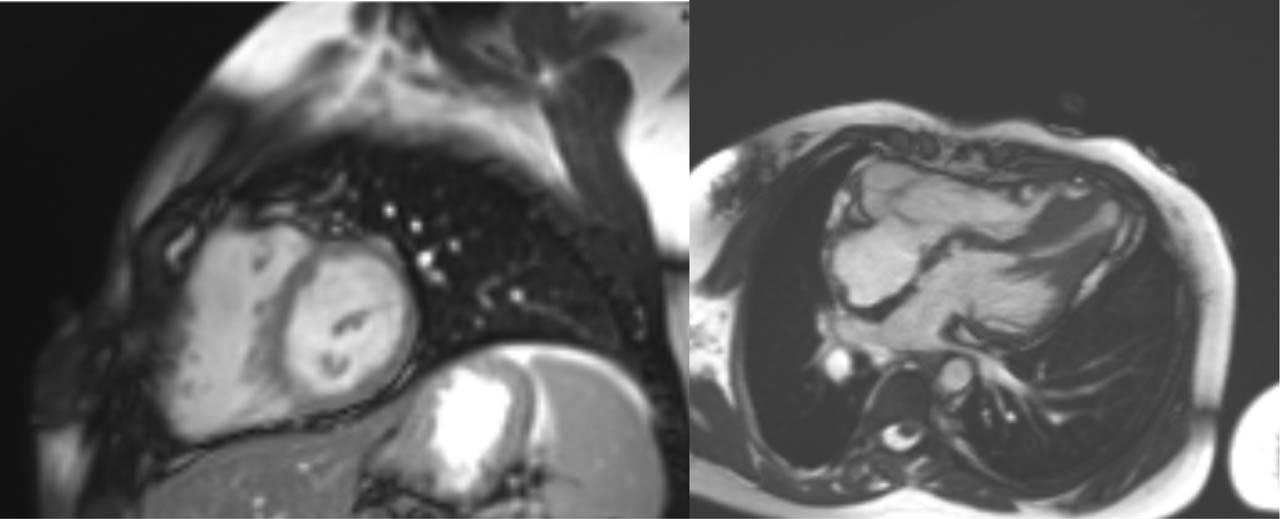 Cine end-diastolic images: Left: short axis at the level of the papillary muscles. Right: four chamber view. Apical left ventricular hypertrophy with a normal sized right ventricle can be observed.