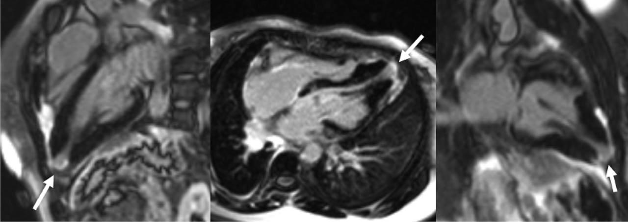 Late gadolinium enhancement images show isolated left ventricular apical fibrosis (arrow). From left to right: three chamber view, four chamber view and two chamber view.