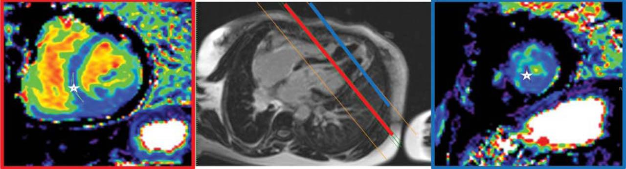 T1 mapping before contrast injection in short axis. Left: level of the papillary muscles. Right: apical level. The stars show the area for which the T1 time is measured: mid septal (non hypertrophied myocardium) 1004 ms with a calculated extracellular volume fraction of 26%, versus apical (hypertrophied myocardium) 1042 ms with a calculated extracellular fraction of 30% - suggestive of interstitial fibrosis in the hypertrophied apical segments.