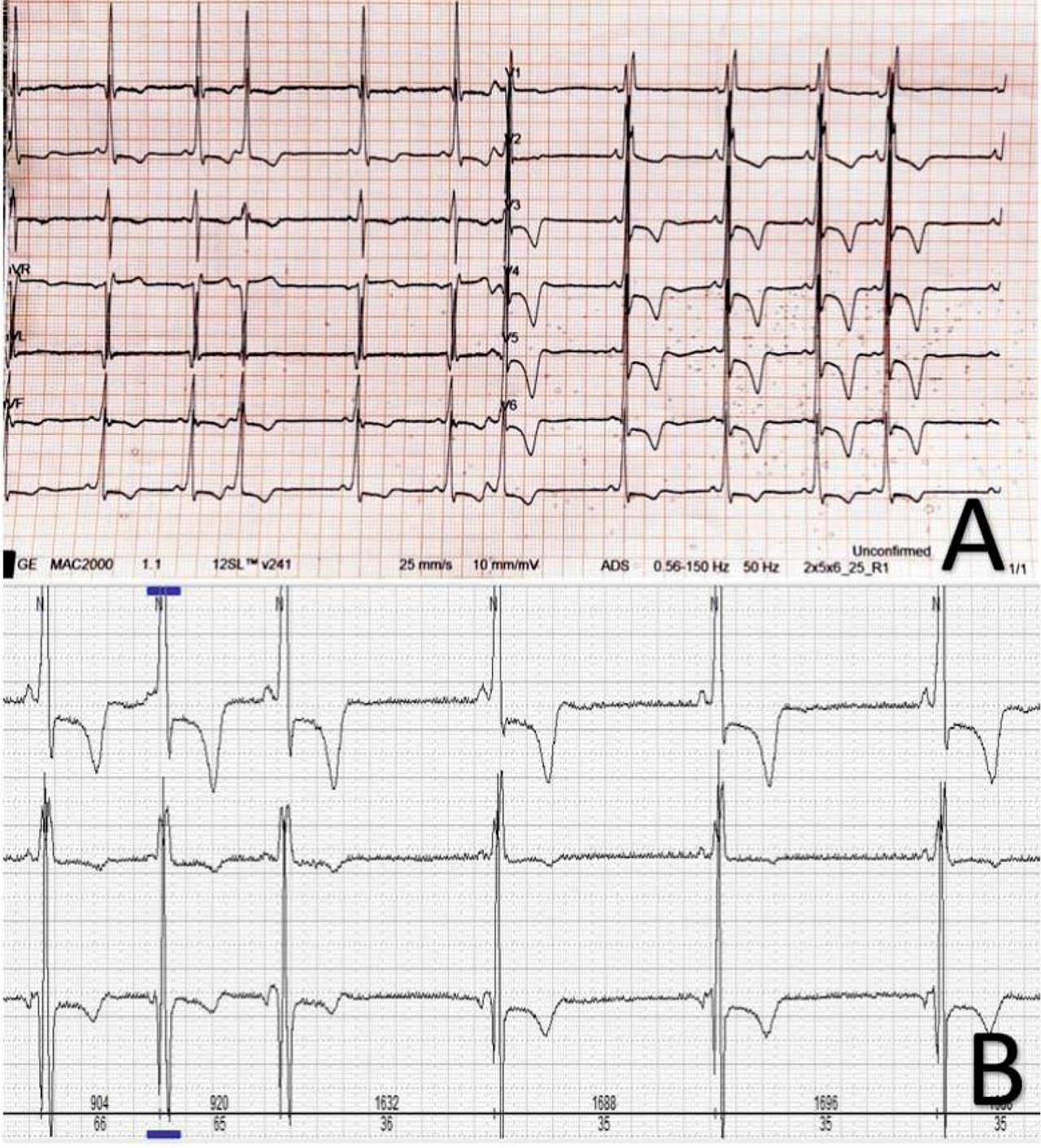 Panel A. Electrocardiogram: short PR interval with slight septal preexcitation appereance, right bundle branch block (more obvious when premature atrial beat occurs – 4th QRS complex), left ventricular hypertrophy voltage criteria with deep inverted T waves in the precordial leads suggestive of apical HCM. Panel B. ECG Holter: 2nd QRS complex is a junctional escape beat (often seen in Fabry disease) followed by marked sinus bradycardia.